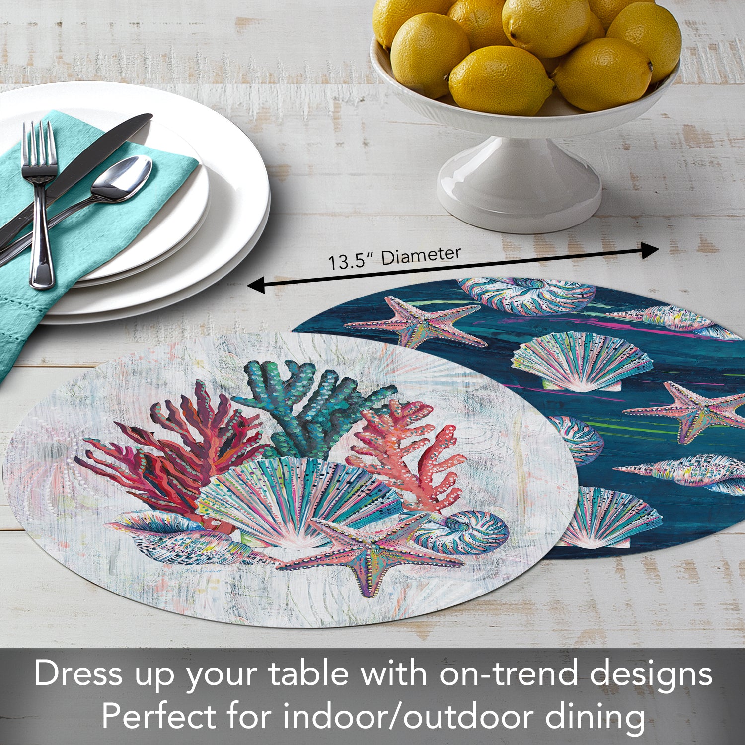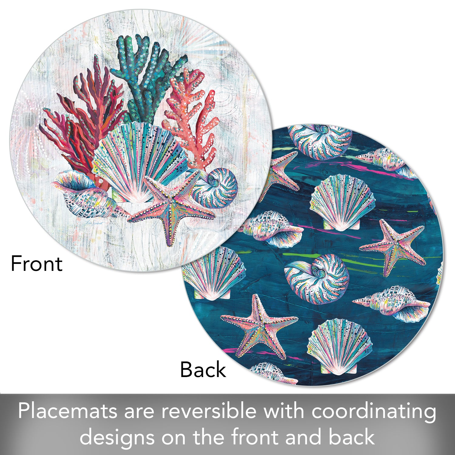 REVERSIBLE-Placemats are reversible, featuring different coordinating designs on both the front and back of each mat. Attractive coordinating designs are great for everyday meals, parties and outdoor entertaining.