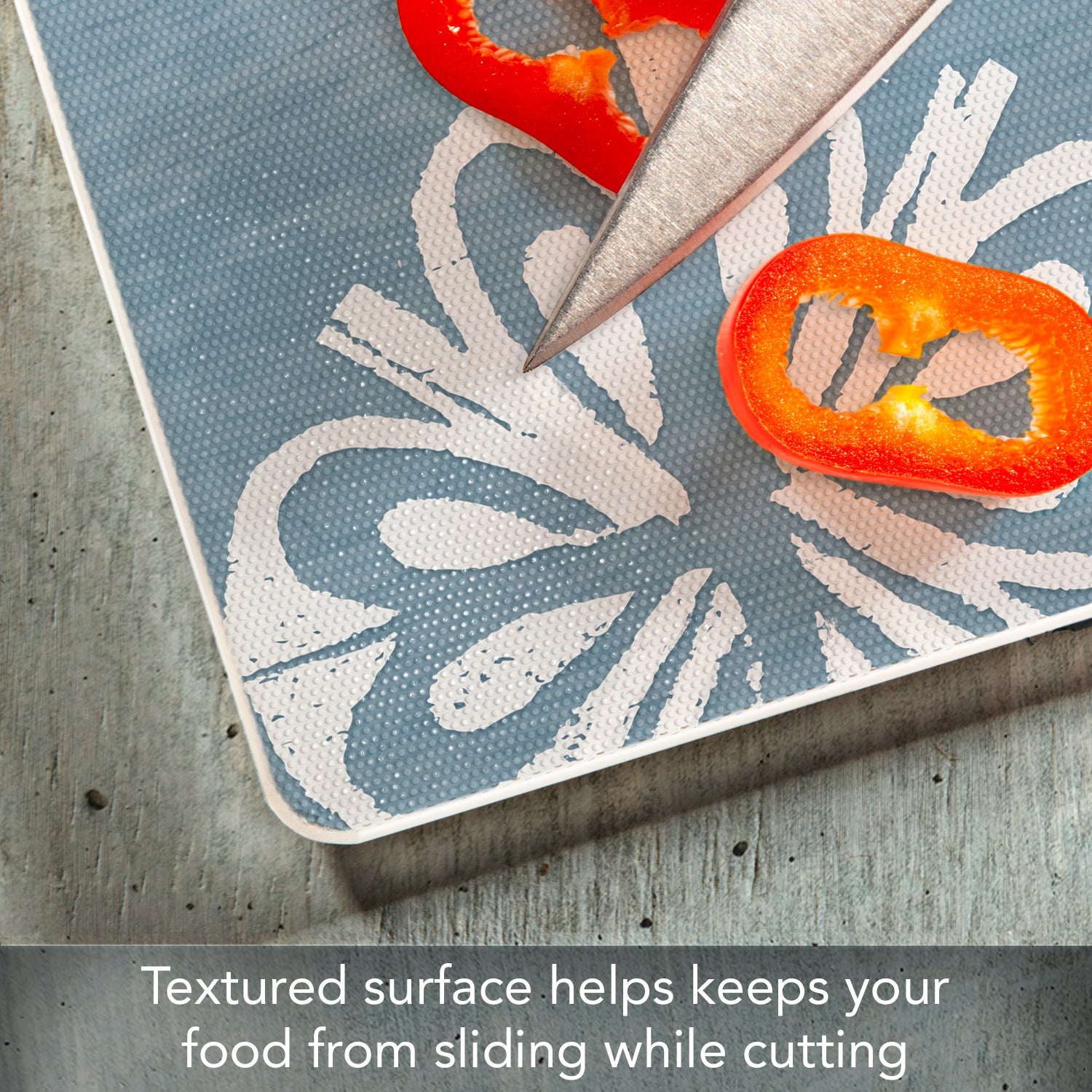 - FEATURES-Surface of Cutting Board is slightly textured to help keep foods stable as they are being chopped and diced. Rubber Non-Skid feet on bottom of the board protects your surfaces from scratches and stains.