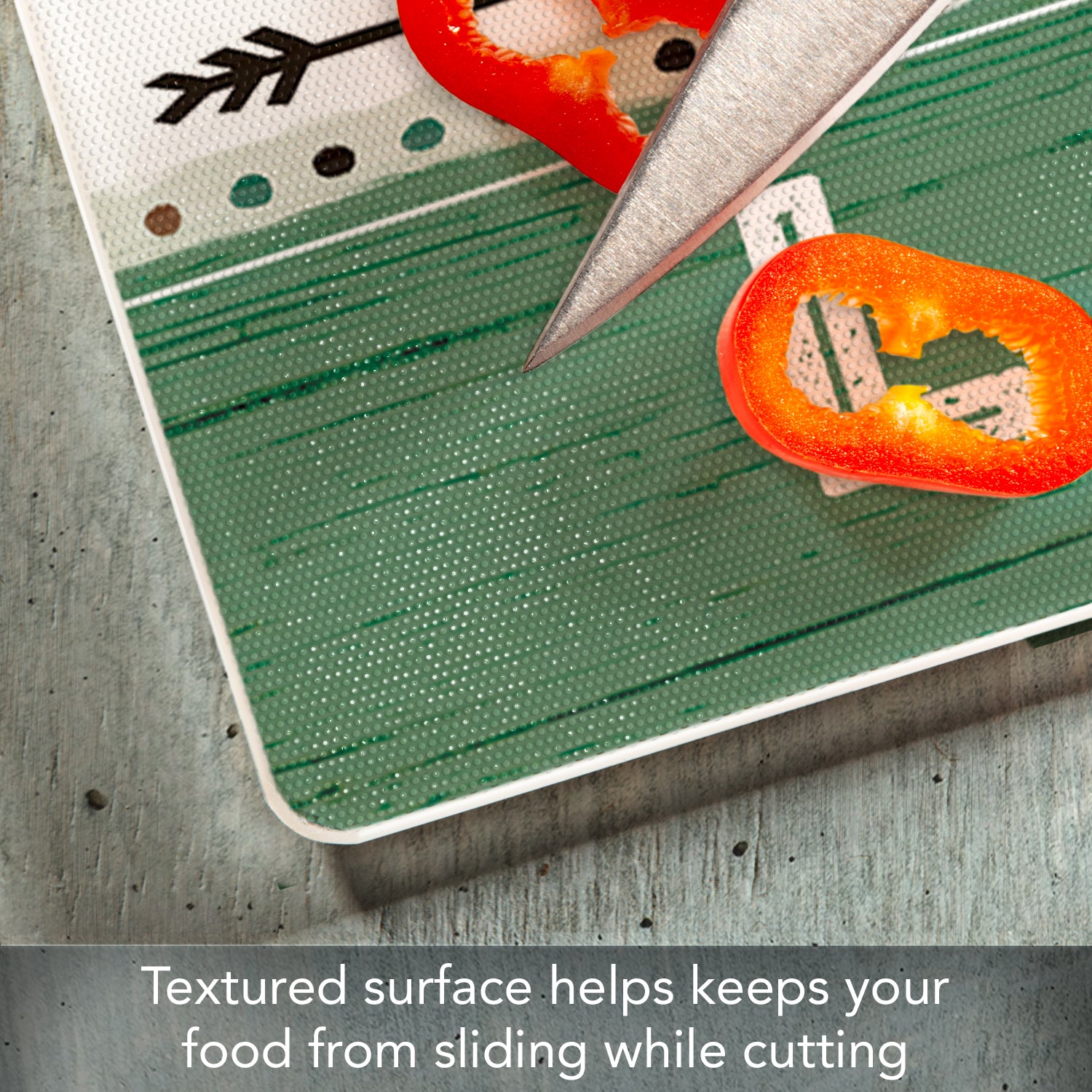 - FEATURES- Surface of Cutting Board is slightly textured to help keep foods stable as they are being chopped and diced. Rubber Non-Skid feet on bottom of the board protects your surfaces from scratches and stains.