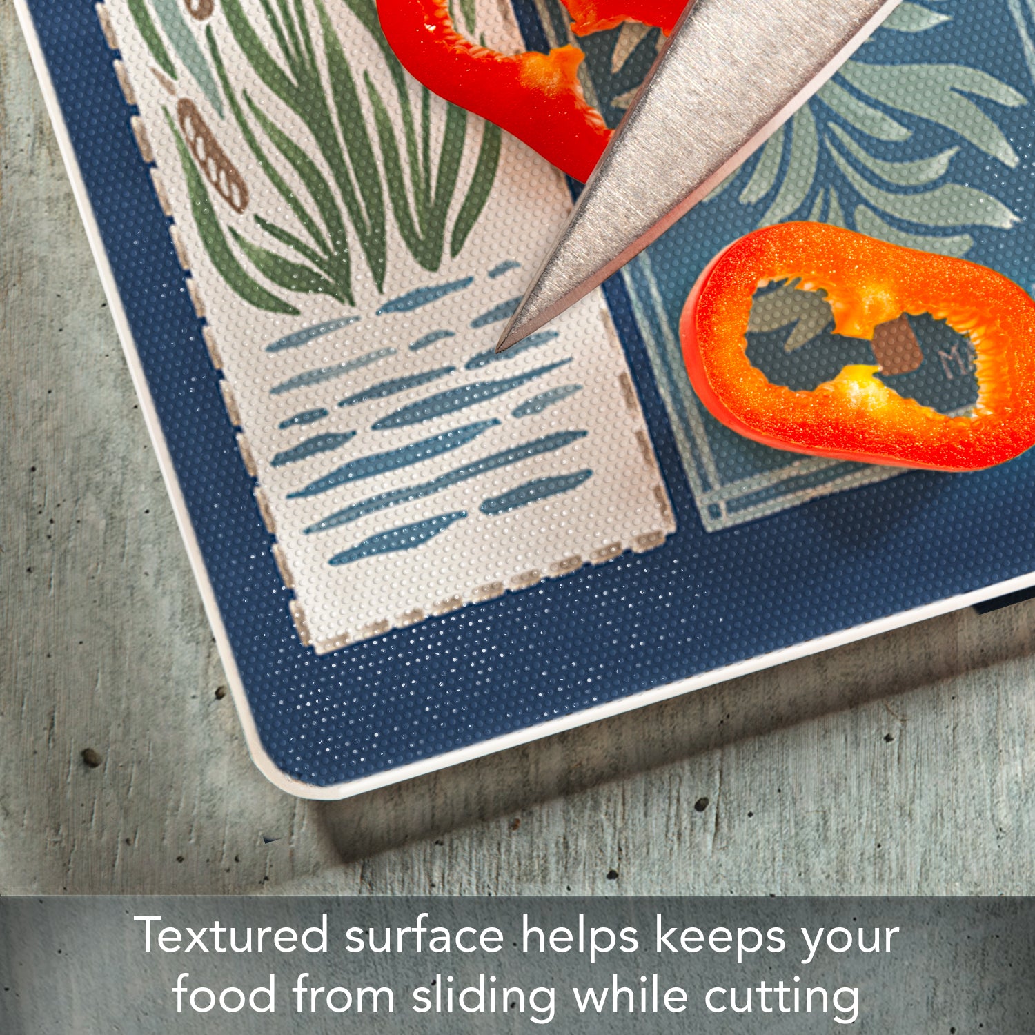 - FEATURES- Surface of Cutting Board is slightly textured to help keep foods stable as they are being chopped and diced. Rubber Non-Skid feet on bottom of the board protects your surfaces from scratches and stains.