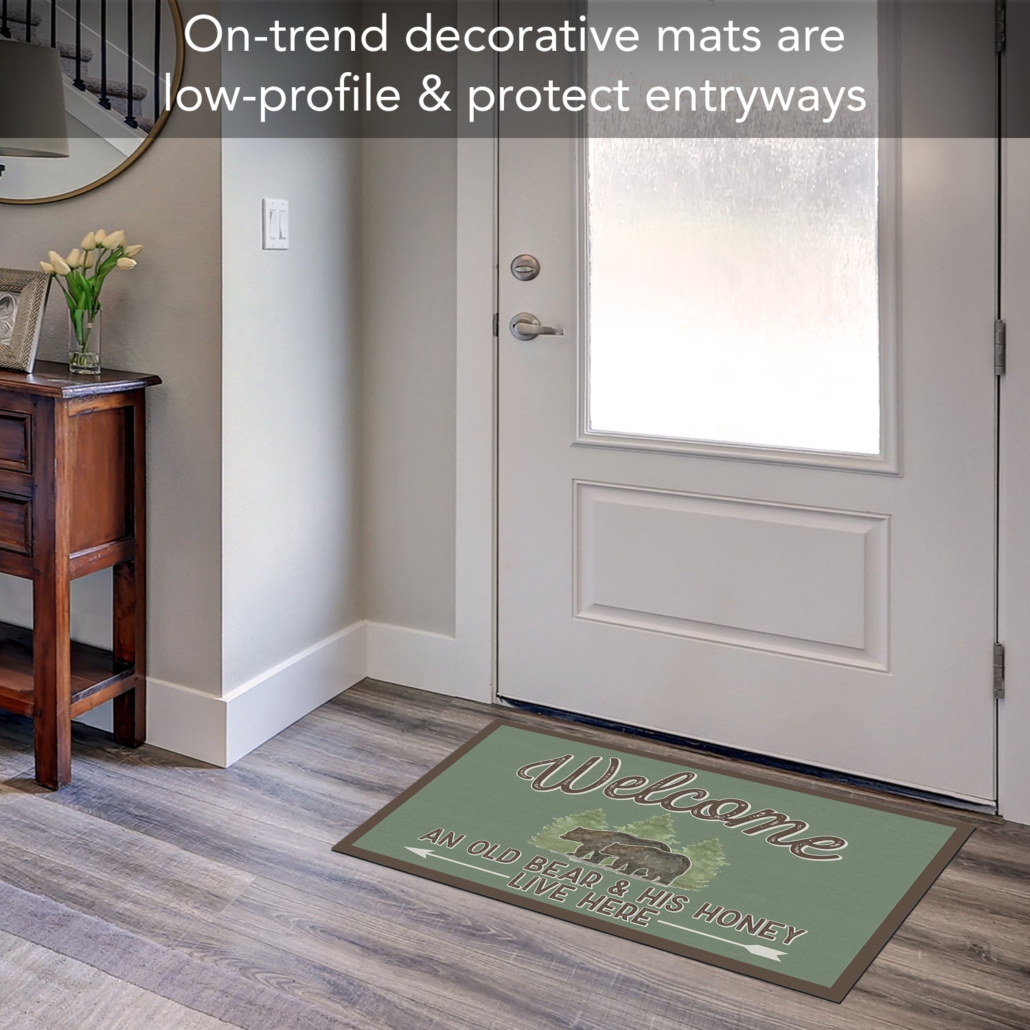 INDOOR/OUTDOOR- Entryway Floor Mat is perfect to welcome guests at the front door as well as protecting high traffic areas inside your home. Constructed of a non-woven polyester blend and rubber backing. Material holds color and vibrancy longer than usual mats.