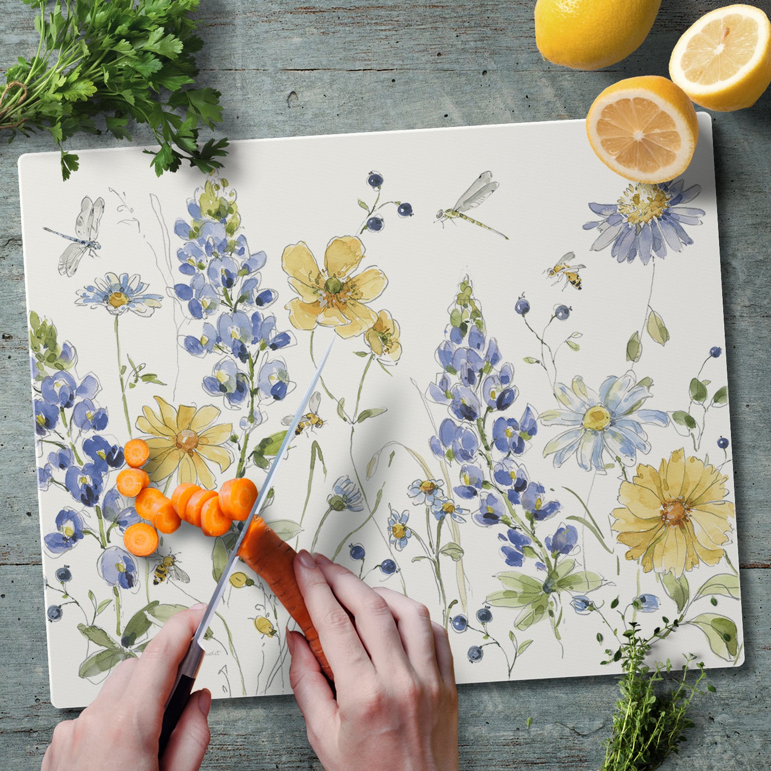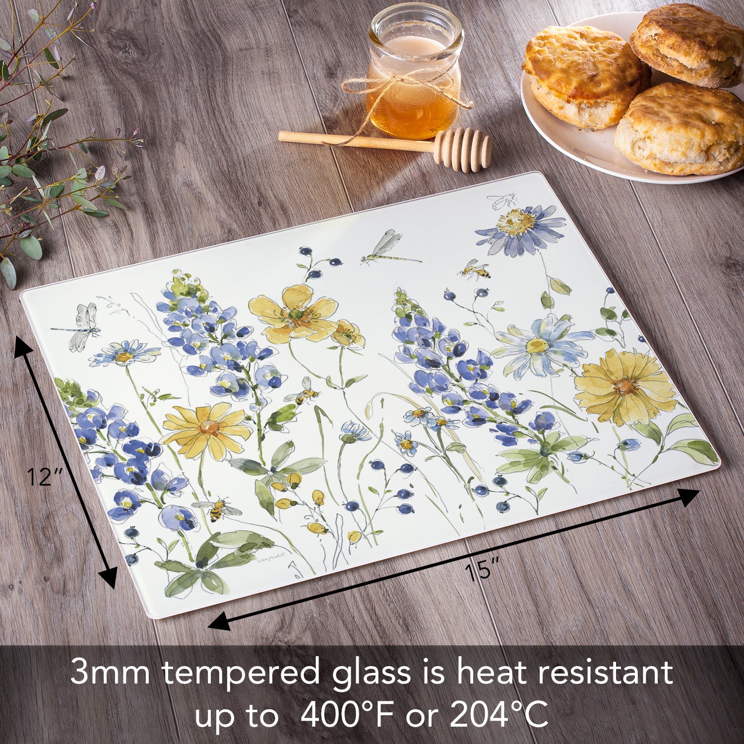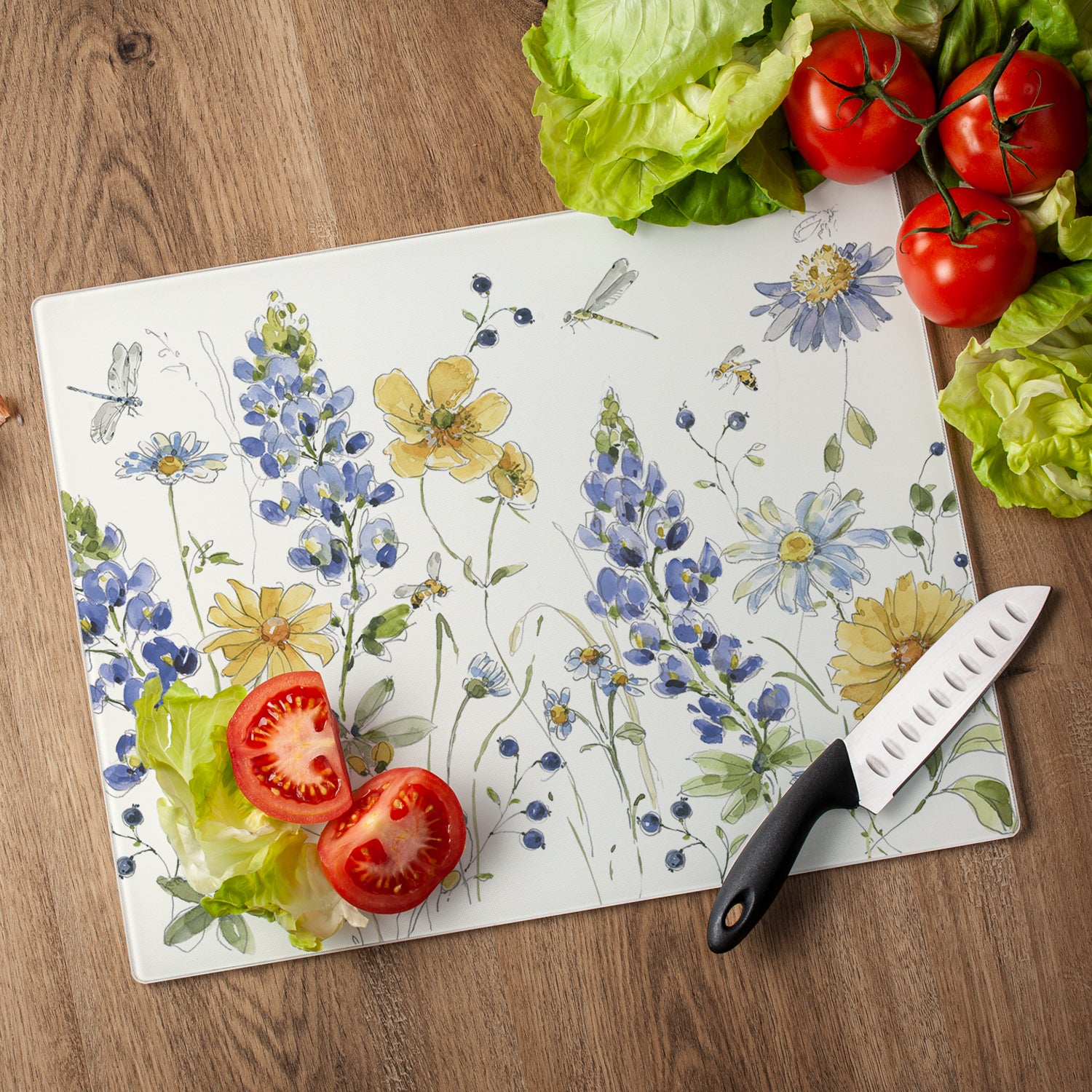 CounterArt Lovely Blue Florals 3mm Tempered Glass Cutting Board 15" x 12" Manufactured in the USA