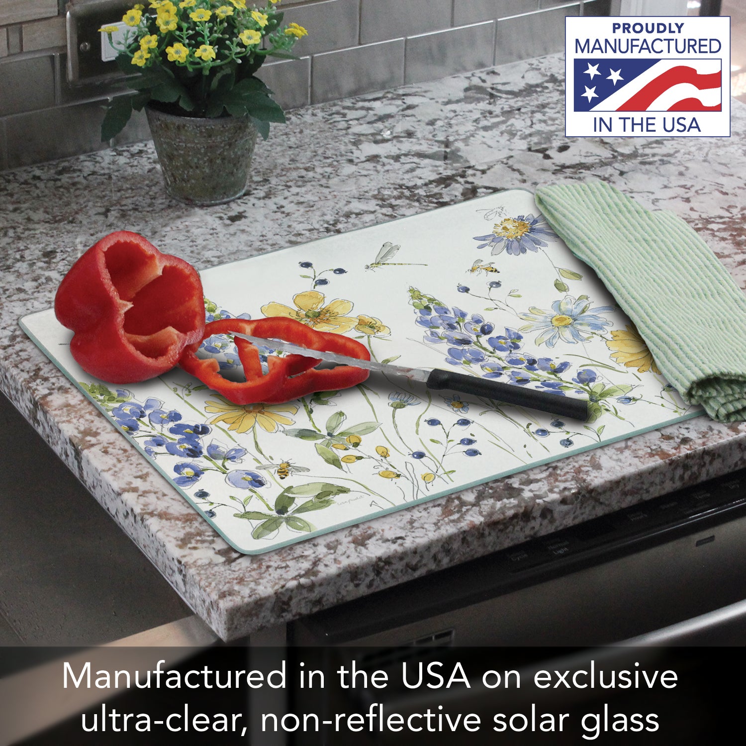 - GLASS CUTTING BOARD-This attractive Cutting Board works great for food preparation, cutting and serving. Manufactured in the USA with durable 3mm Tempered Glass.