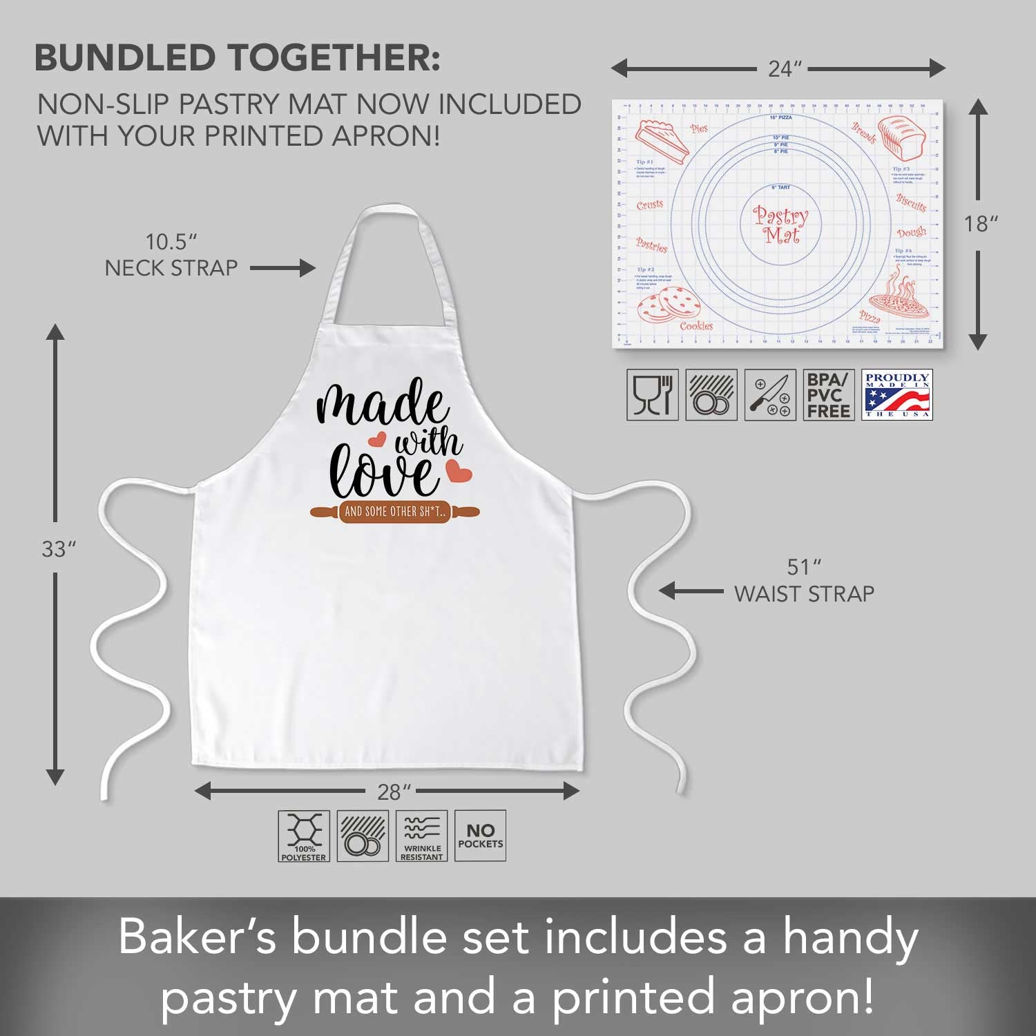 MEASURES- Apron measures 33” x 28”. Straps are 10.5”. Waist straps are 51”, making this apron a one size fits all item. Pastry Mat measures 24” x 18”.