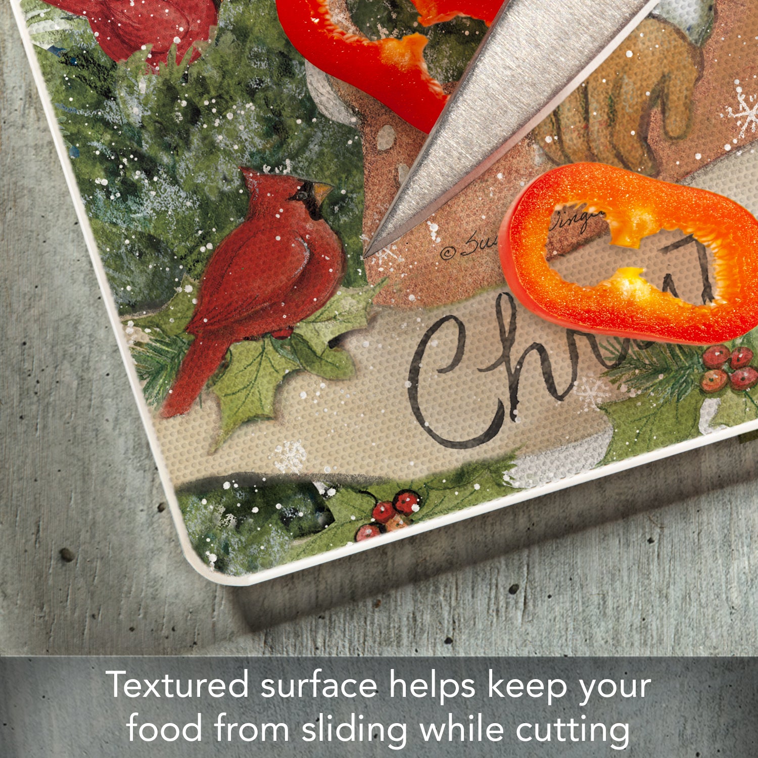 - FEATURES- Surface of Cutting Board is slightly textured to help keep foods stable as they are being chopped and diced. Rubber Non-Skid feet on bottom of the board protects your surfaces from scratches and stains.