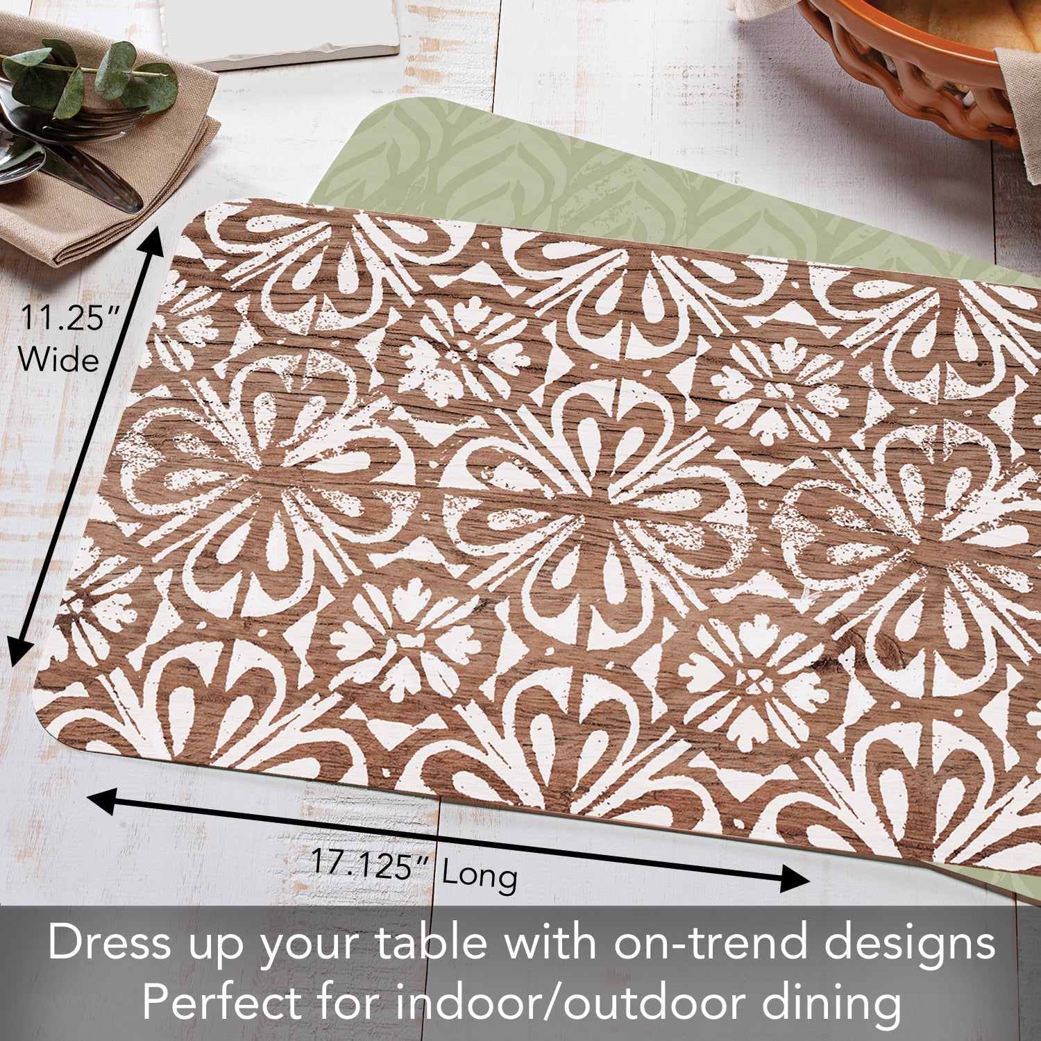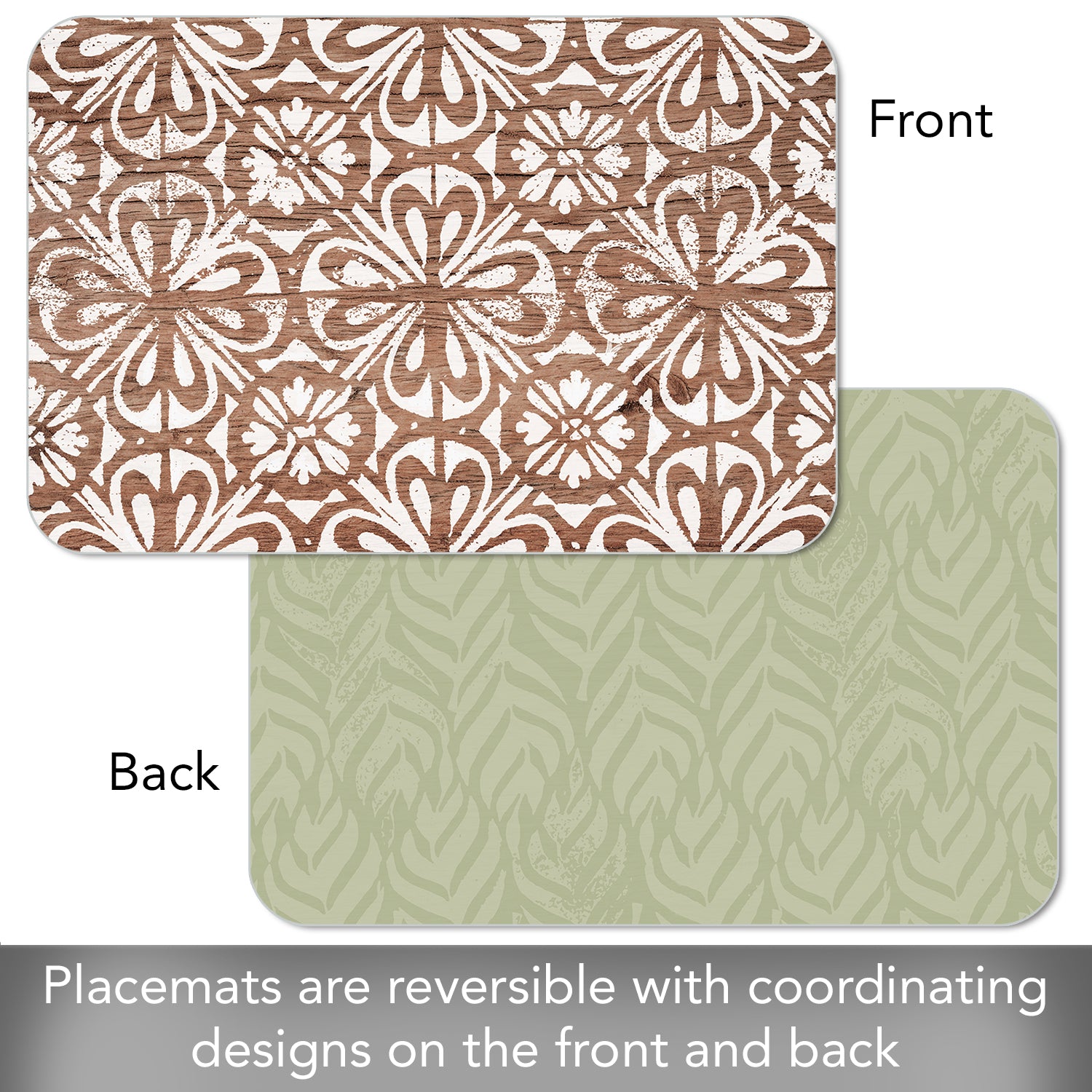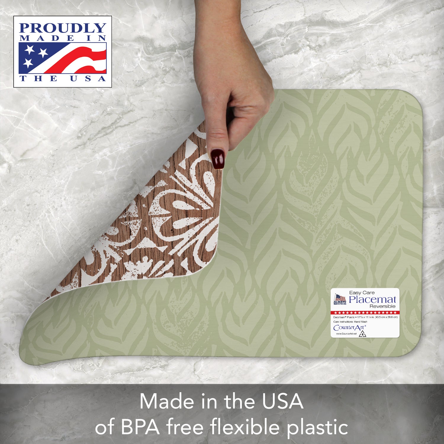 REVERSIBLE-Each Placemat features a coordinating design printed on the opposite side. Placemats are constructed of BPA and PVC free flexible plastic.