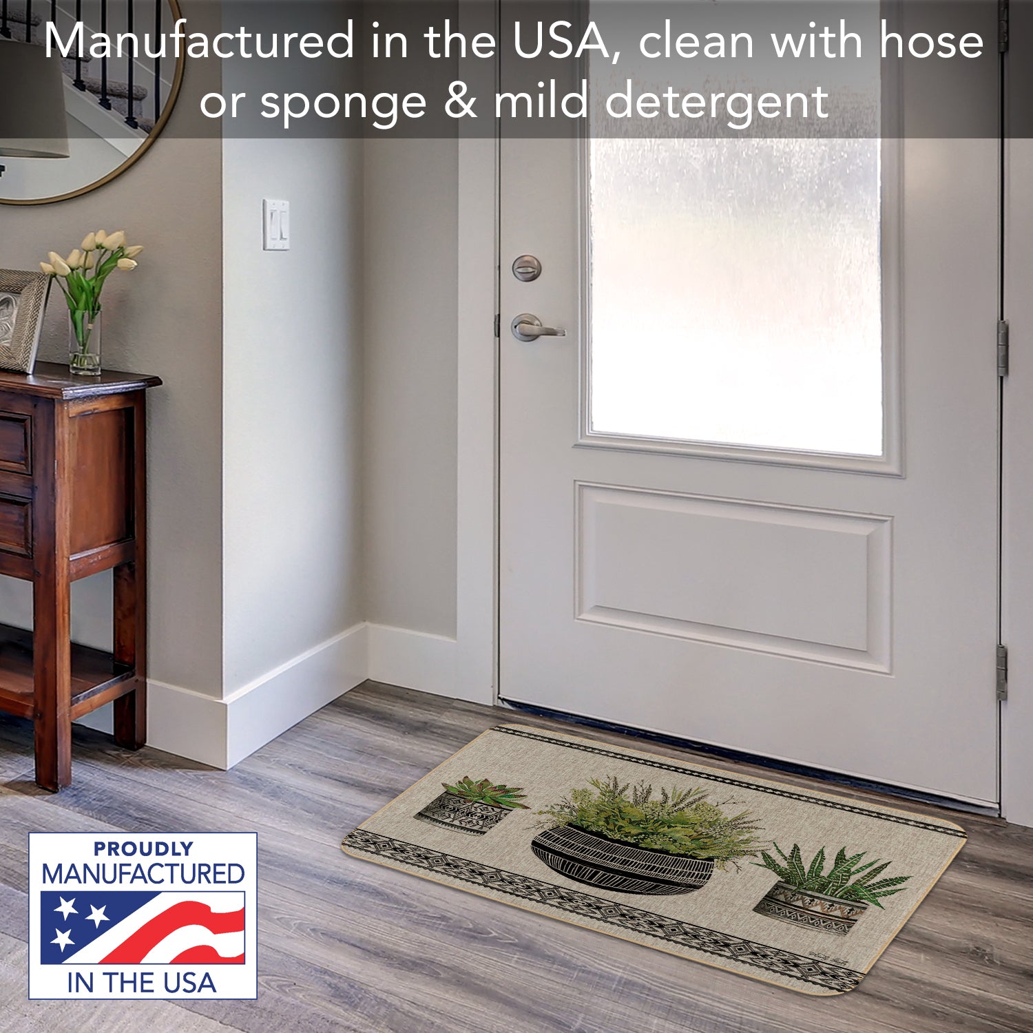 DURABLE & EASY TO CLEAN- Durable Woven Polyester surface with stitched edging has a look of natural linen. Non-skid rubber backing keeps the Floor Mat in place. Floor Mat is easy to clean with mild soap and water or by spraying off with garden hose then lying flat to dry.