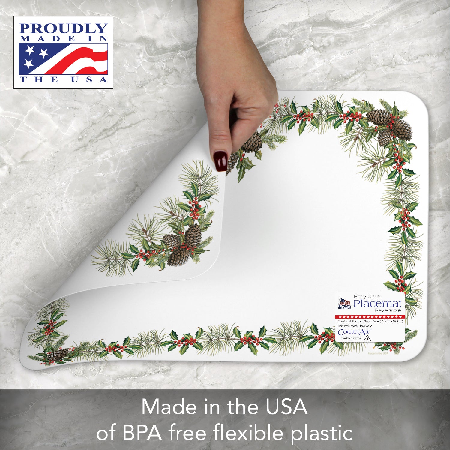 REVERSIBLE-Each Placemat features a coordinating design printed on the opposite side. Placemats are constructed of BPA and PVC free flexible plastic.