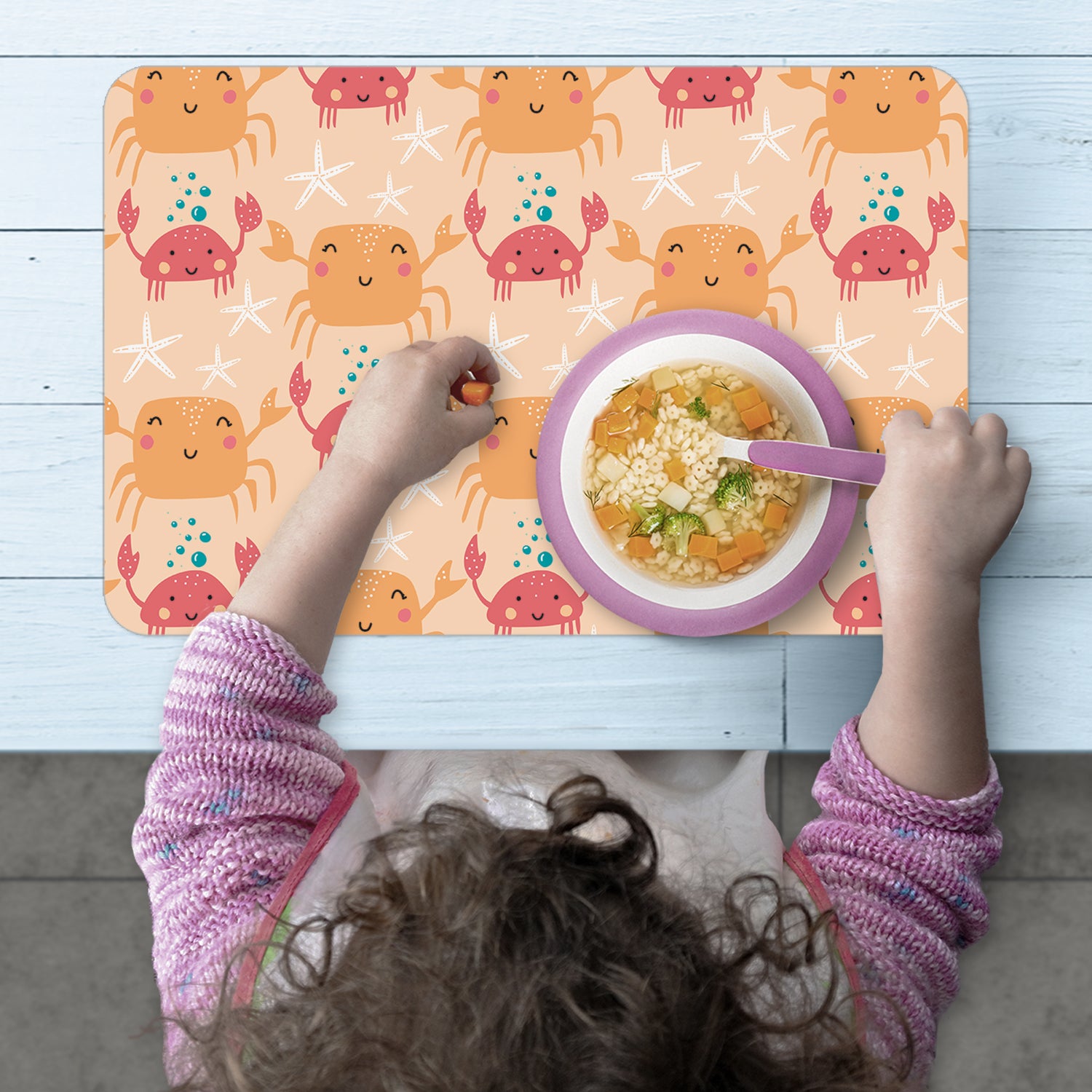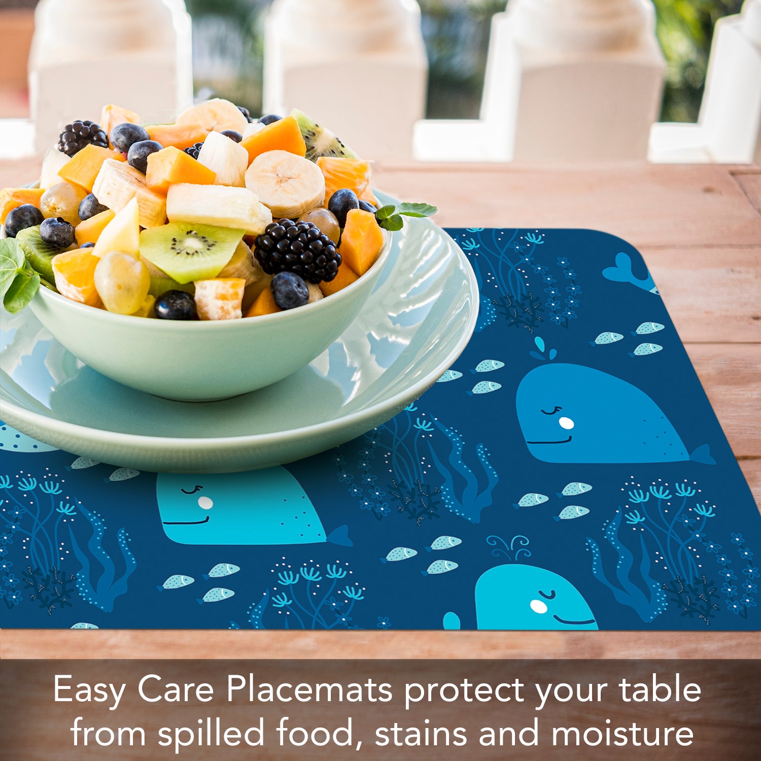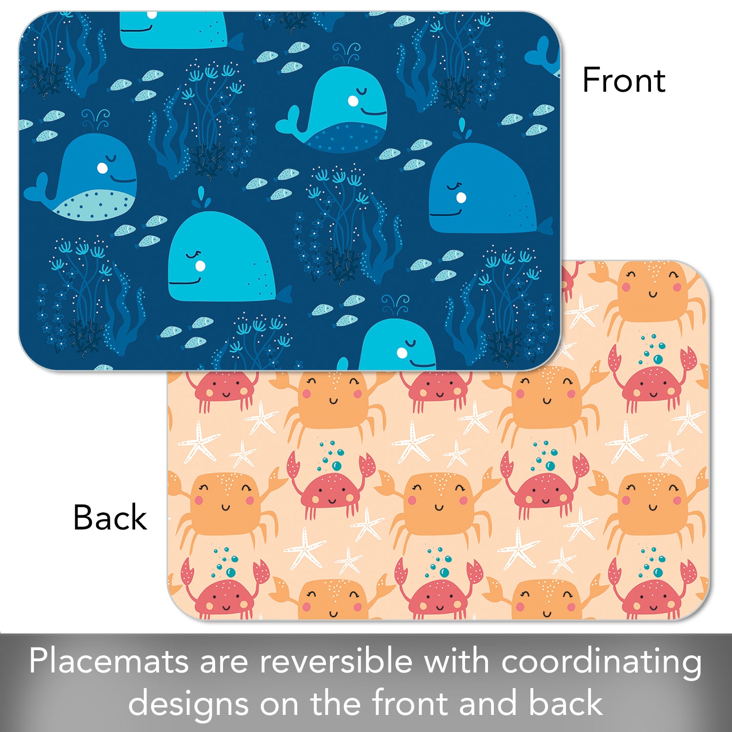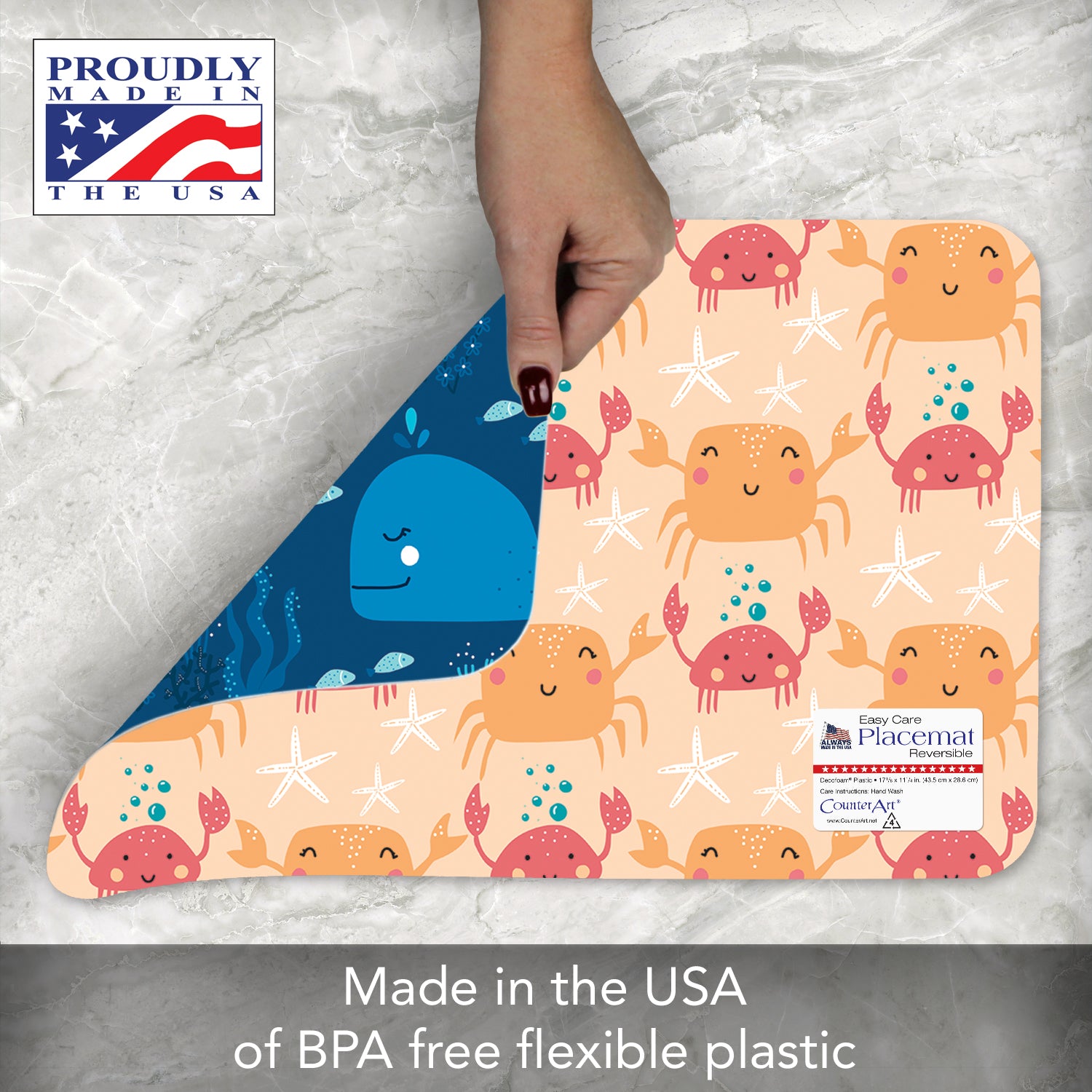 REVERSIBLE-Each Placemat features a coordinating design printed on the opposite side. Placemats are constructed of BPA and PVC free flexible plastic.