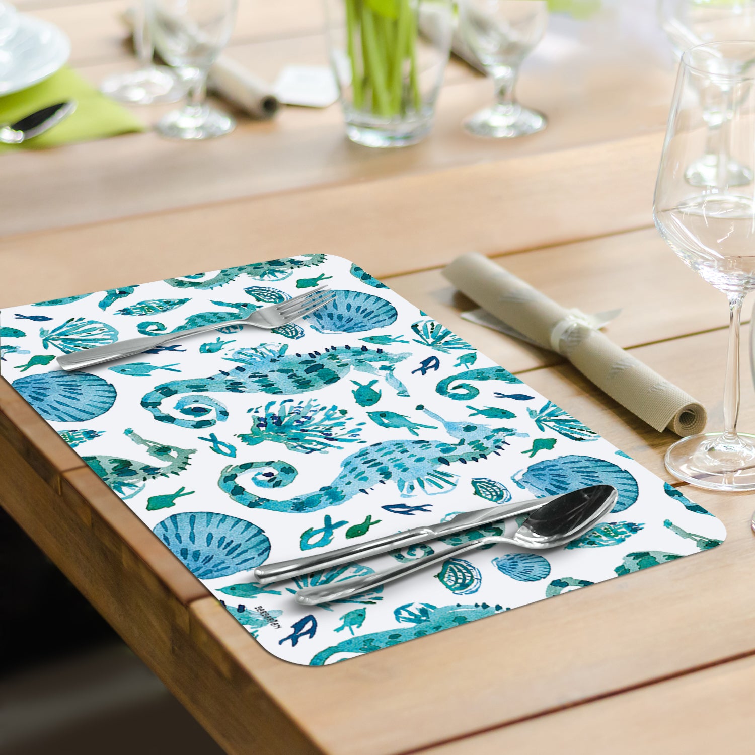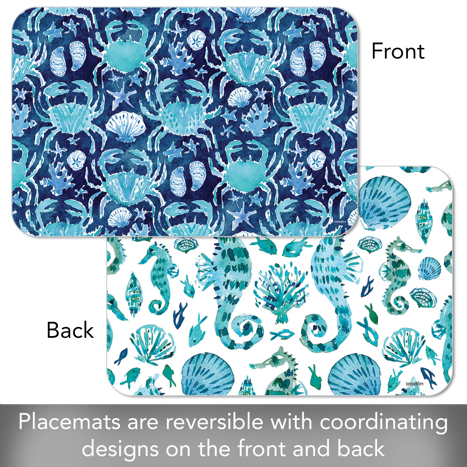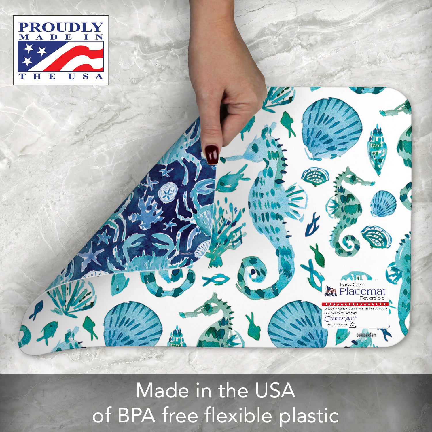 REVERSIBLE-Each Placemat features a coordinating design printed on the opposite side. Placemats are constructed of BPA and PVC free flexible plastic.