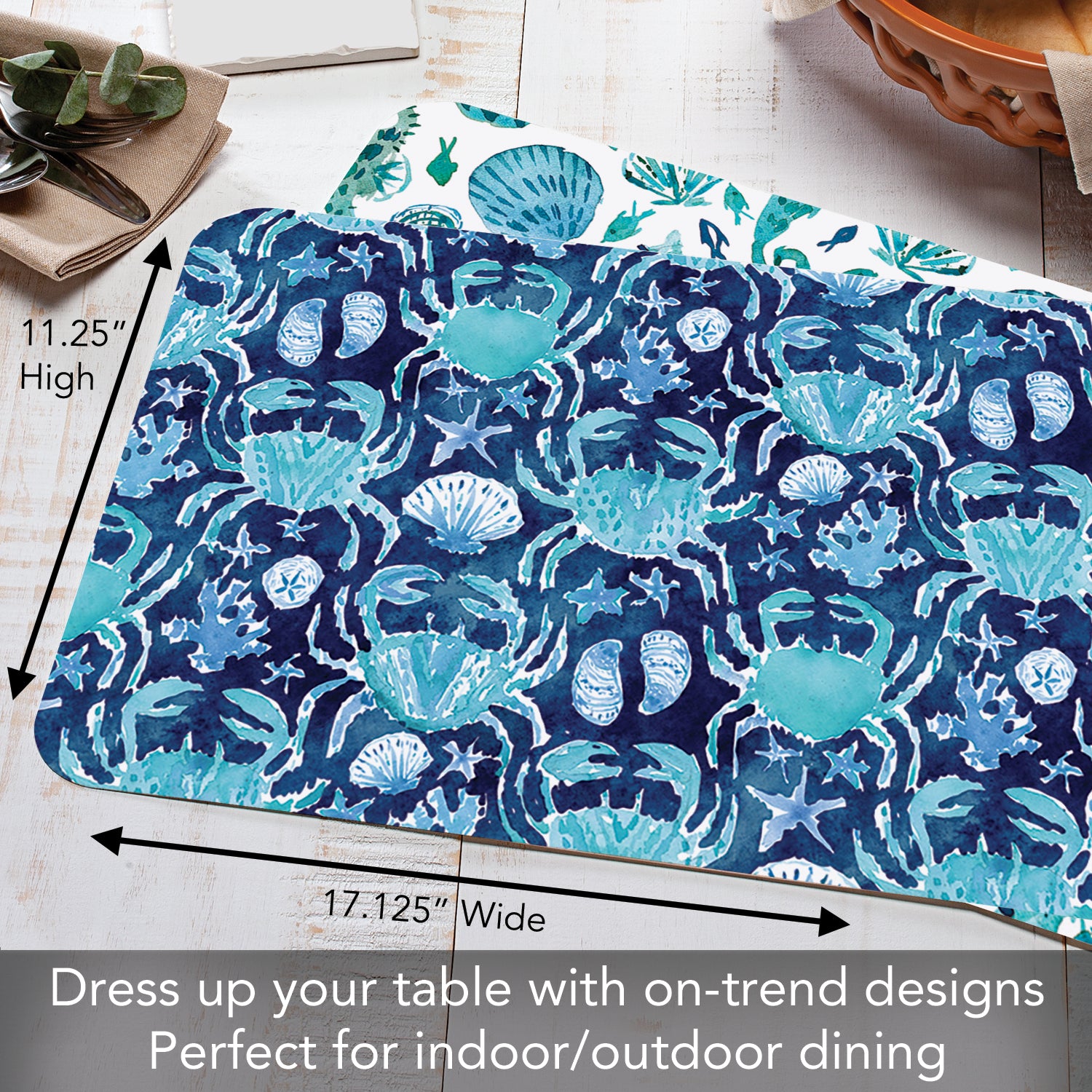 MEASUREMENTS-Each Placemat measures 17.13” x 11.25” x 0.15”. Placemats are an easy and inexpensive way to change the look of your dining space. Check out our Seasonal designs to decorate for the Holidays.