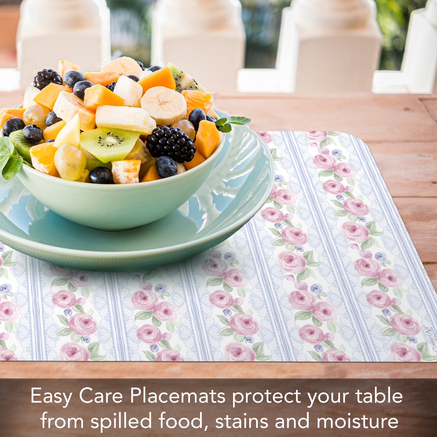 EASY CARE-Placemats can easily be wiped clean with soap and water. The flexibility of these Placemats makes for easy clean up. Easily funnel crumbs or meal remnants from the table to the trash receptacle.