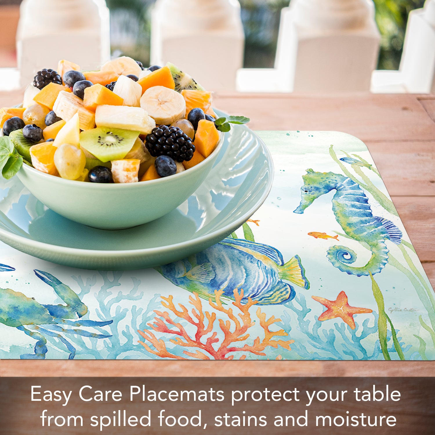 PROTECTS SURFACES-Placemats protect your table or countertop from spilled food, scratches, or stains. Placemat material prevents liquids from soaking through to your surfaces which may cause water rings or damage.