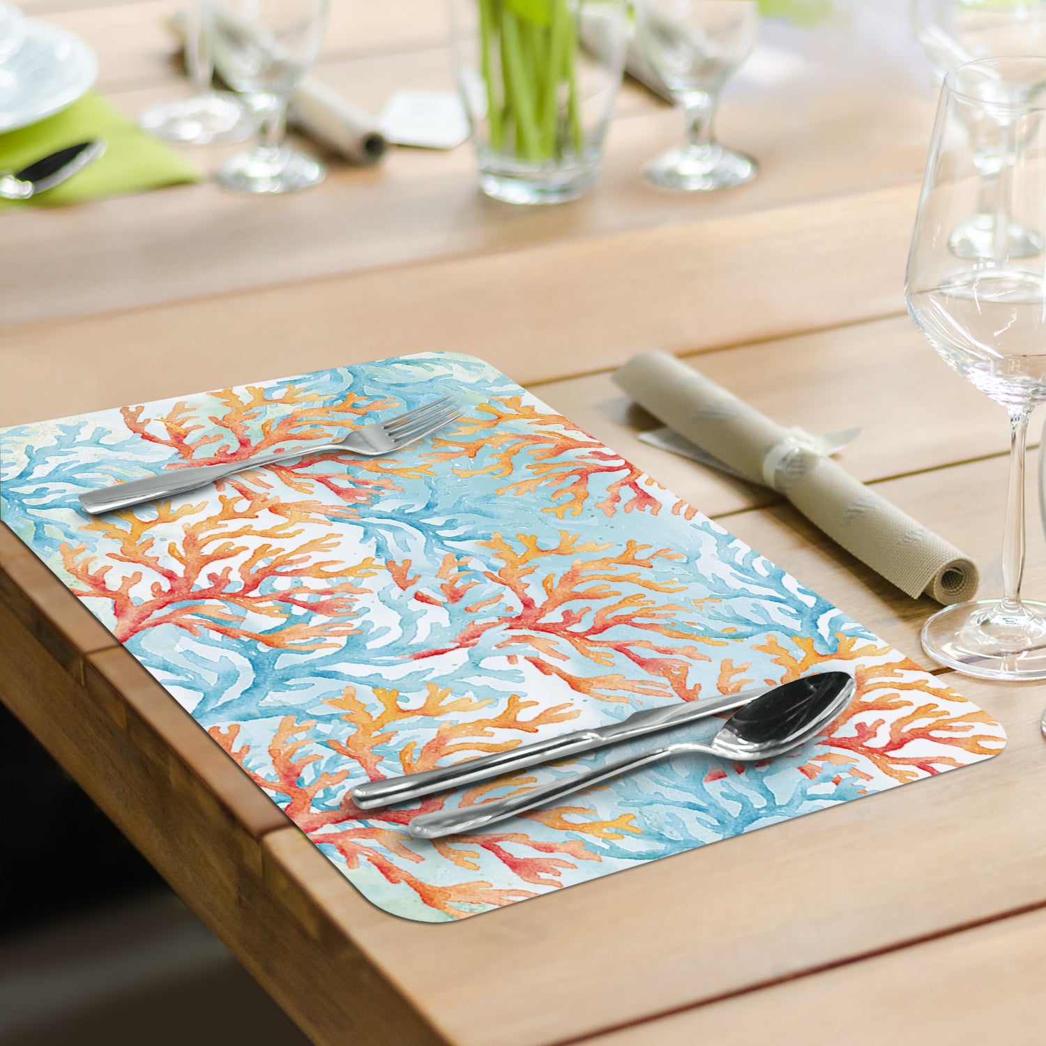 REVERSIBLE-Each Placemat features a coordinating design printed on the opposite side. Placemats are constructed of BPA and PVC free flexible plastic.