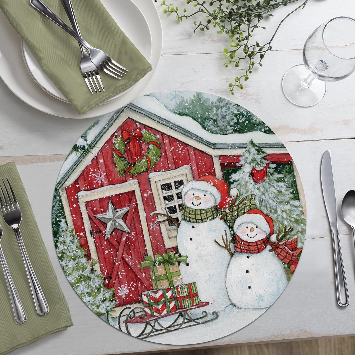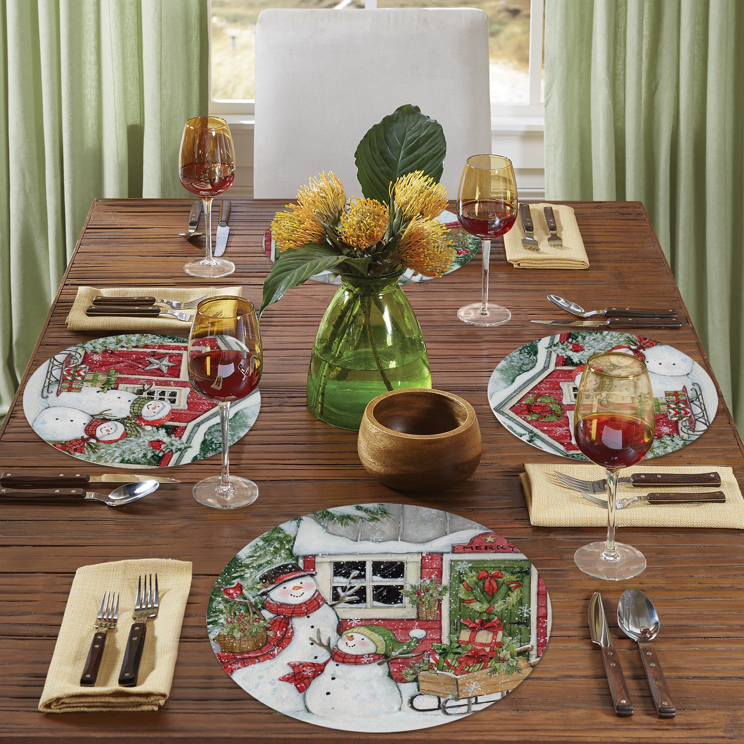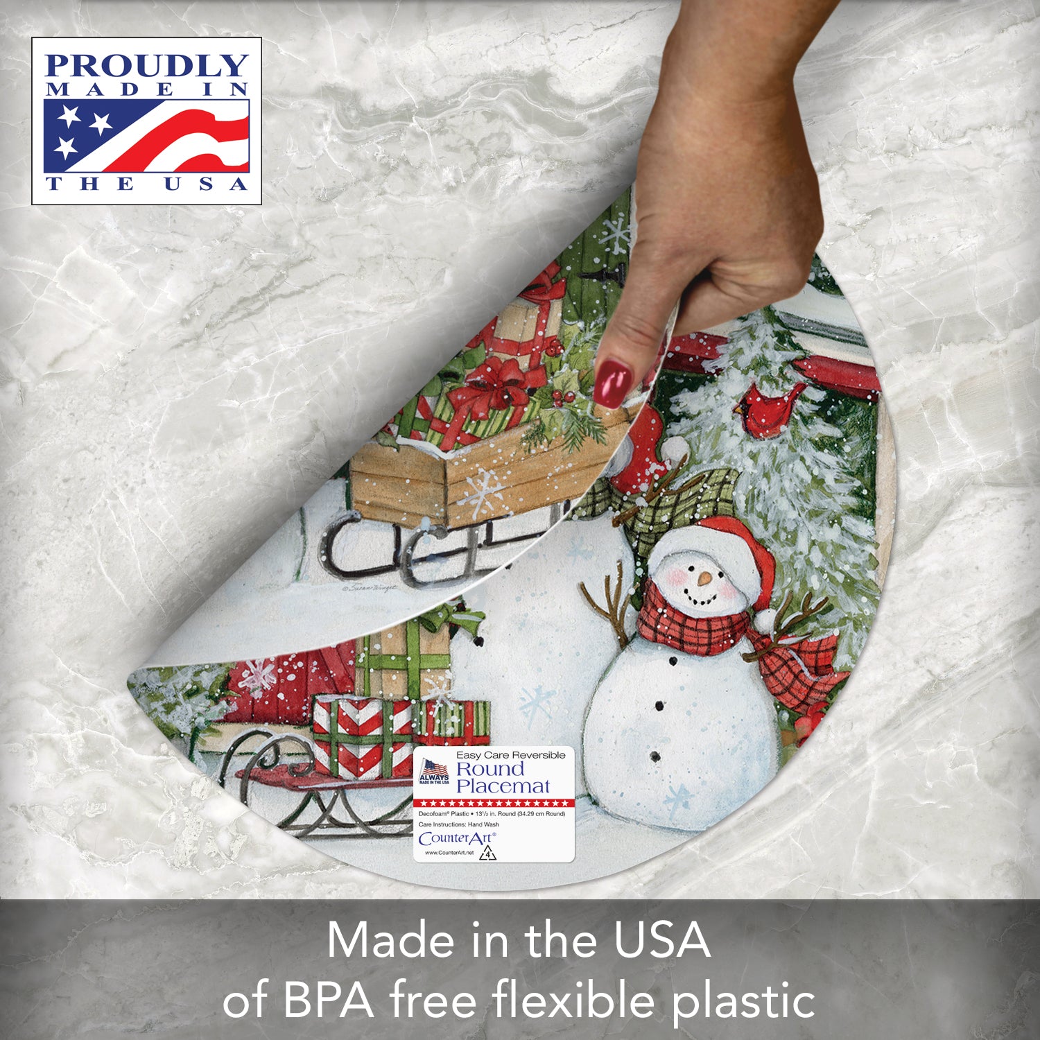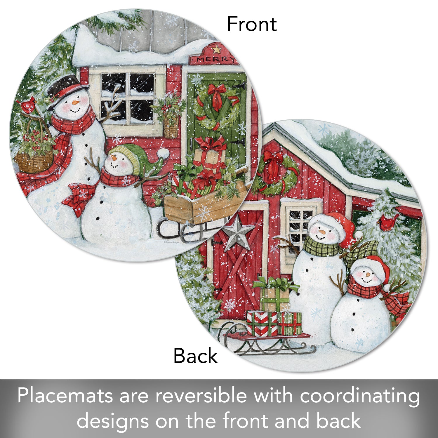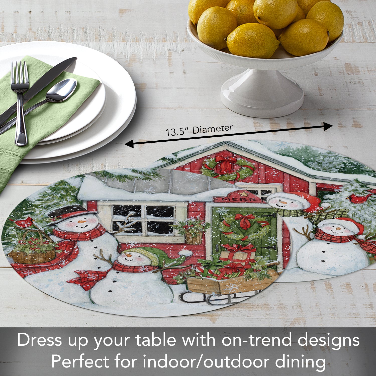 CounterArt Snowman's Farmhouse 4 Pack Round Reversible Easy Care Flexible Plastic Placemats Made in The USA 13.5" Diameter