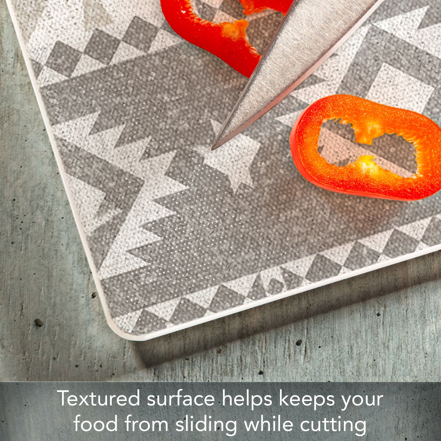 - FEATURES- Surface of Cutting Board is slightly textured to help keep foods stable as they are being chopped and diced. Rubber Non-Skid feet on bottom of the board protects your surfaces from scratches and stains.