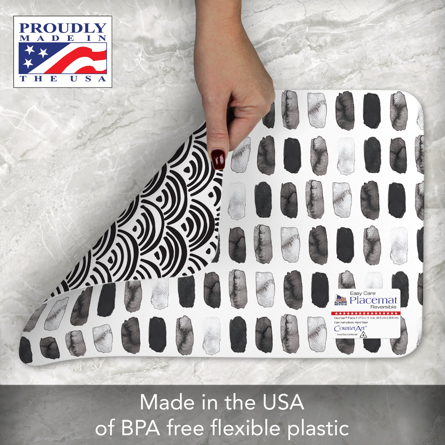 REVERSIBLE-Each Placemat features a coordinating design printed on the opposite side. Placemats are constructed of BPA and PVC free flexible plastic.