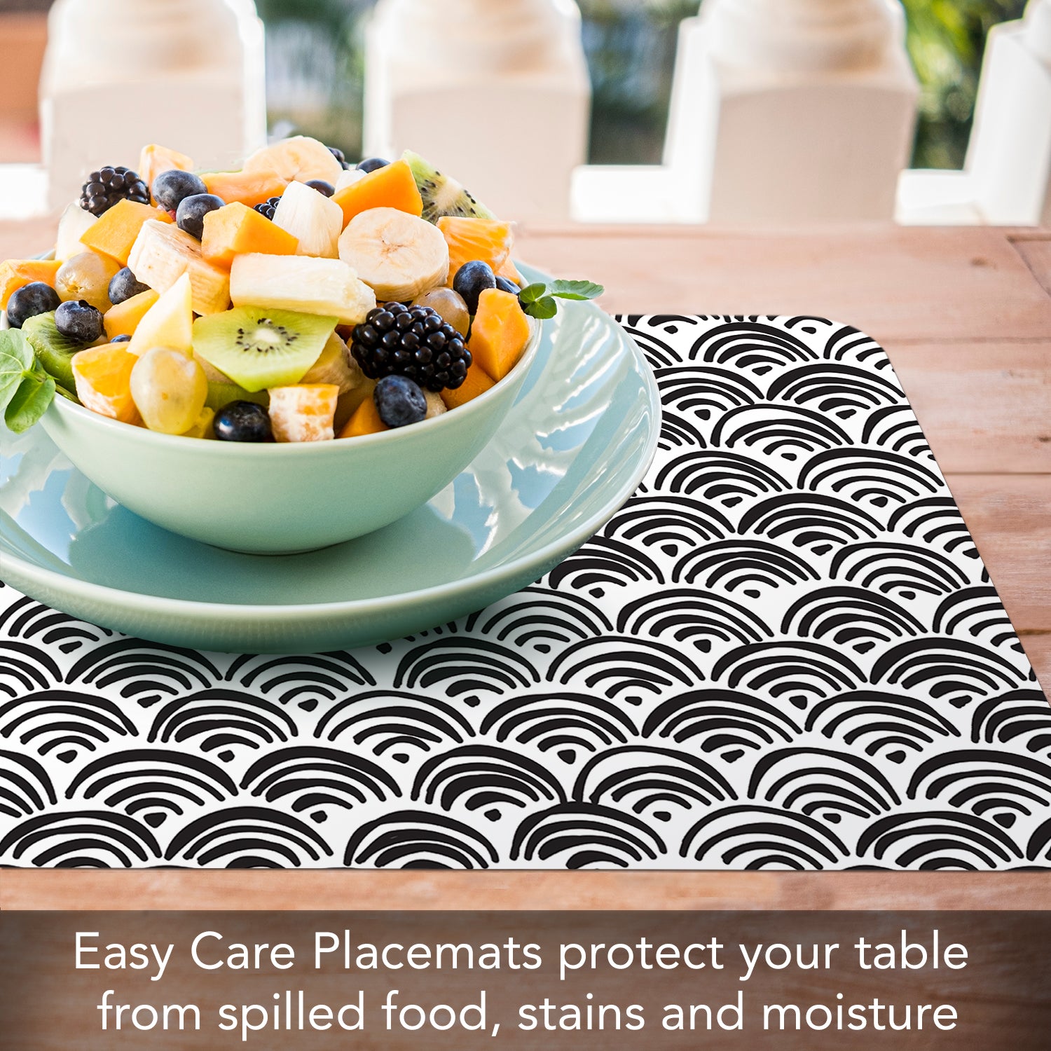 PROTECTS SURFACES-Placemats protect your table or countertop from spilled food, scratches, or stains. Placemat material prevents liquids from soaking through to your surfaces which may cause water rings or damage.
