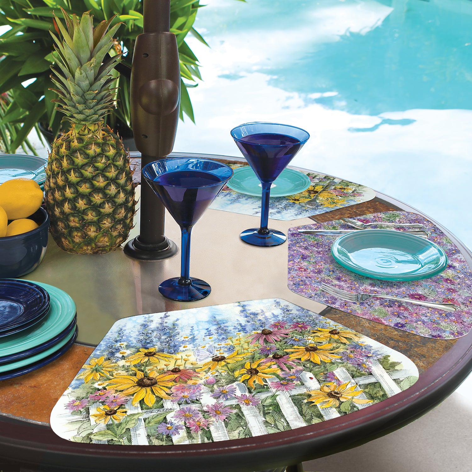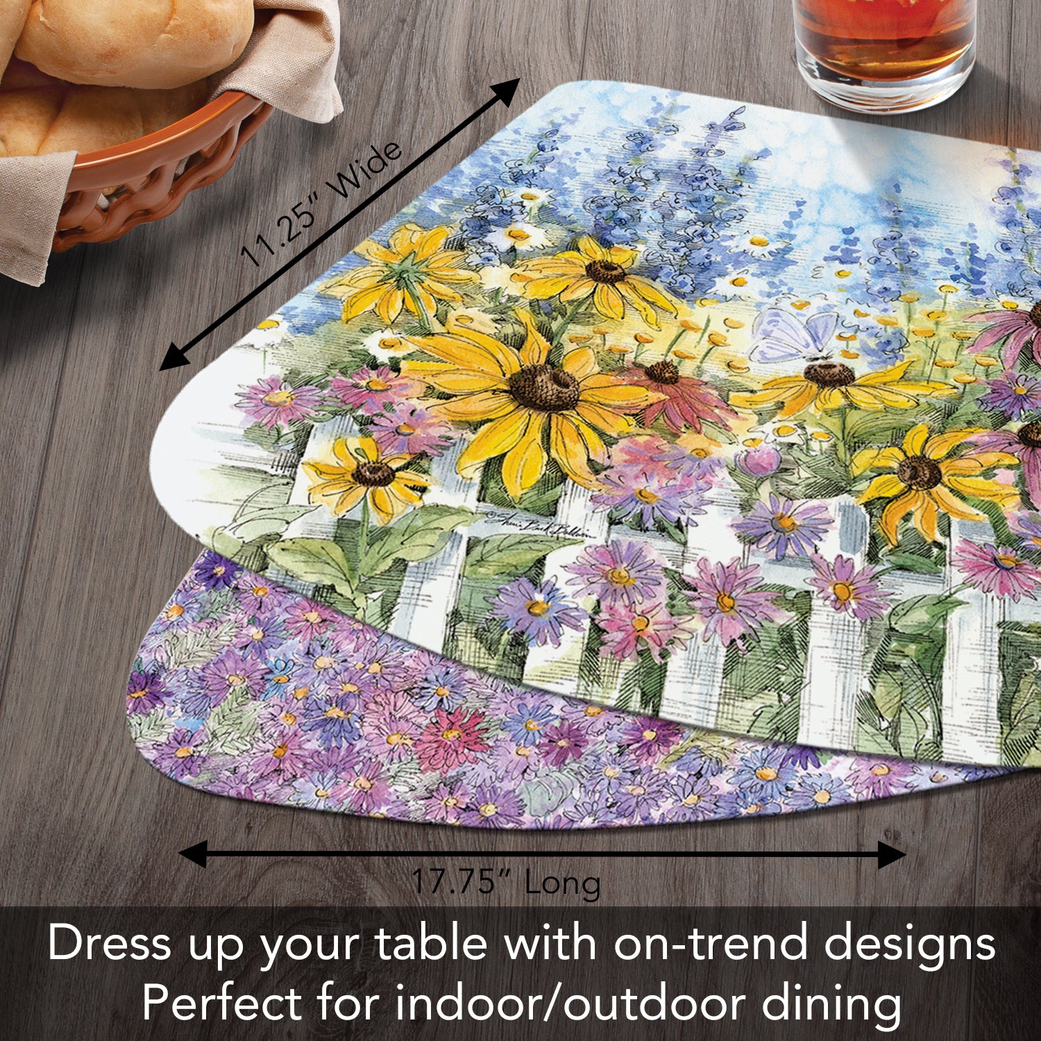 REVERSIBLE WEDGE SHAPE-Placemats are reversible, featuring different coordinating designs on both the front and back of each mat. Attractive coordinating designs are great for everyday meals, parties and outdoor entertaining.
