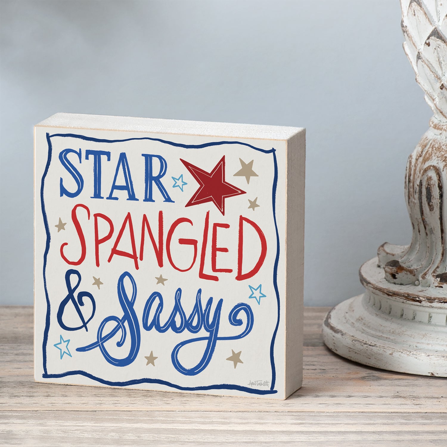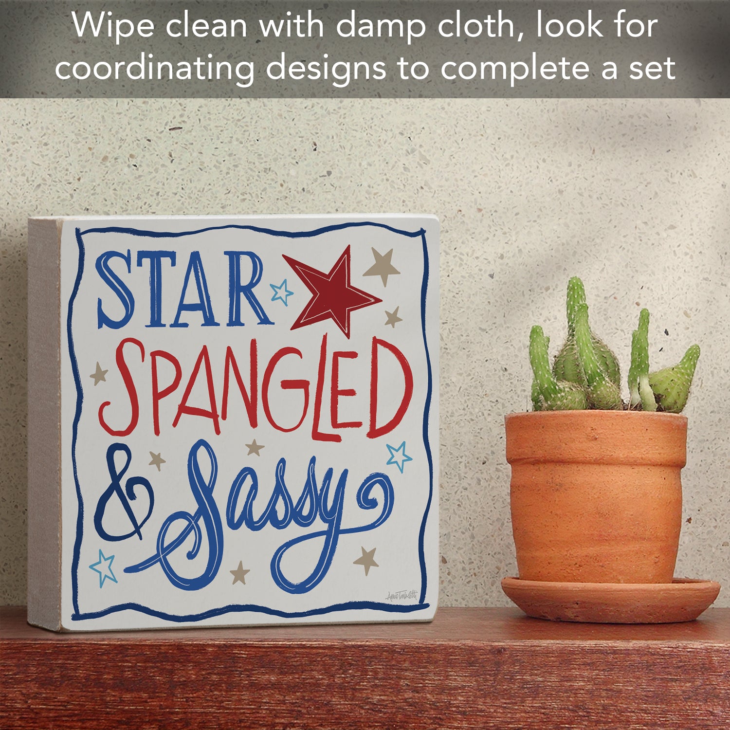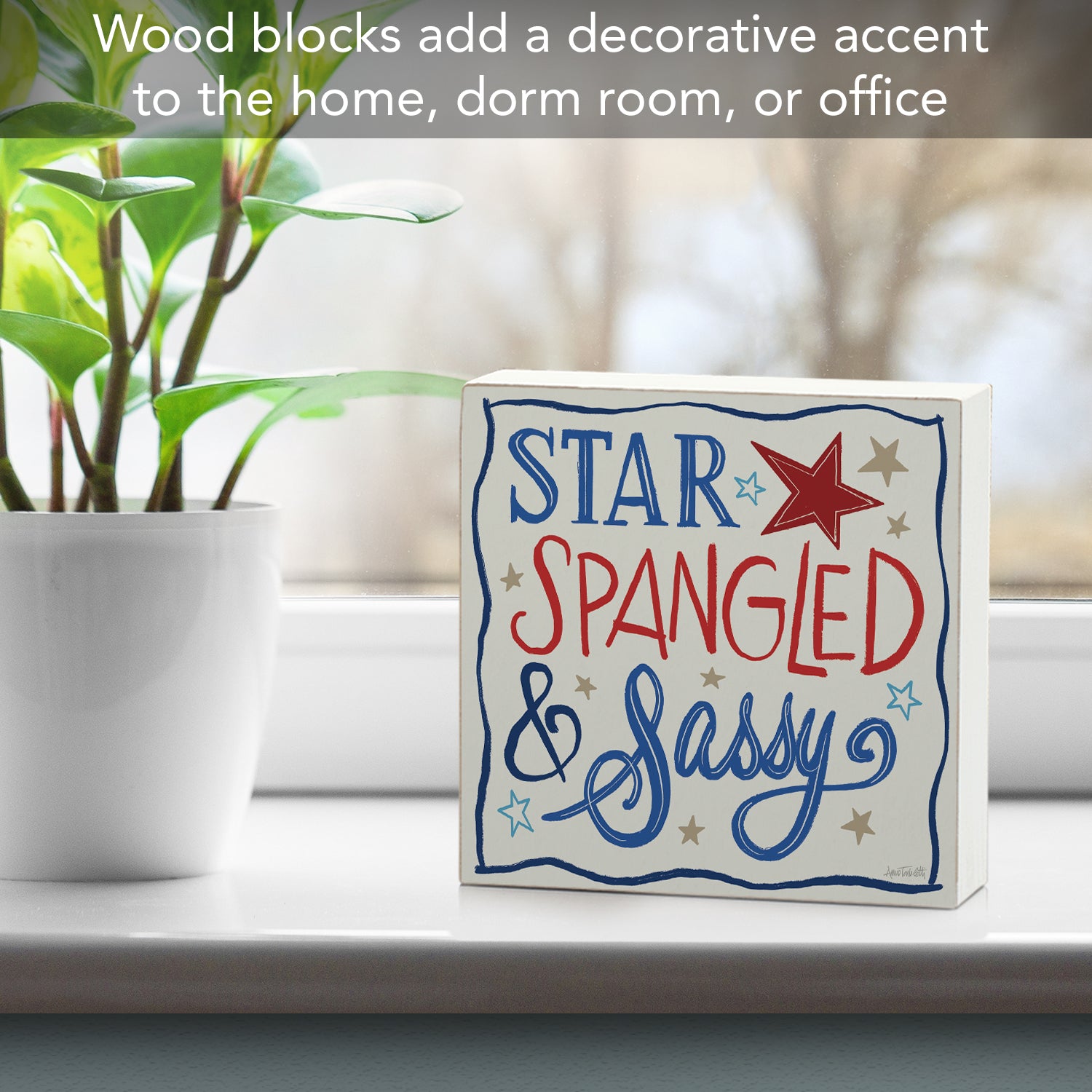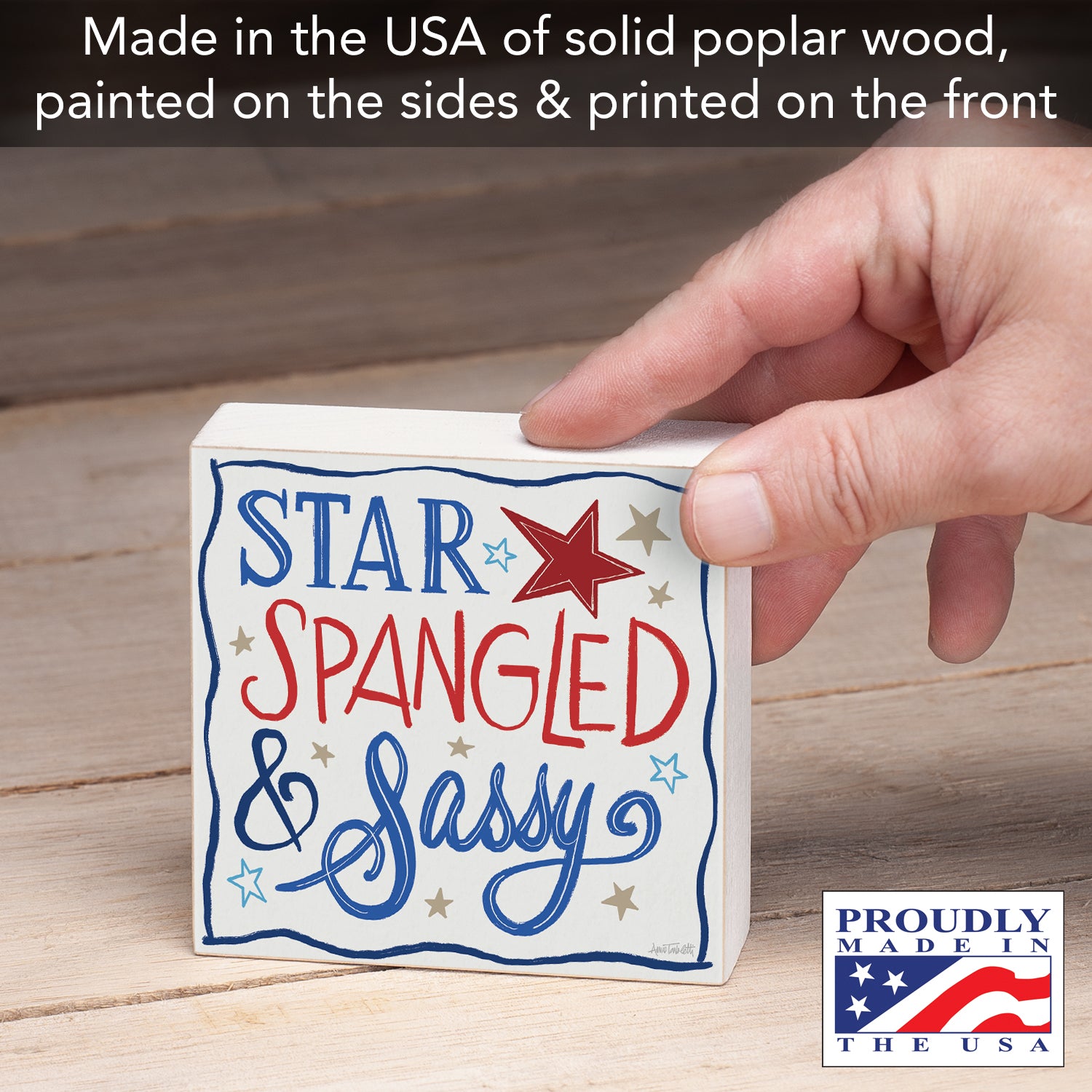 Star Spangled Freestanding Solid Wood Block Sign Made in the USA 3.75” Square