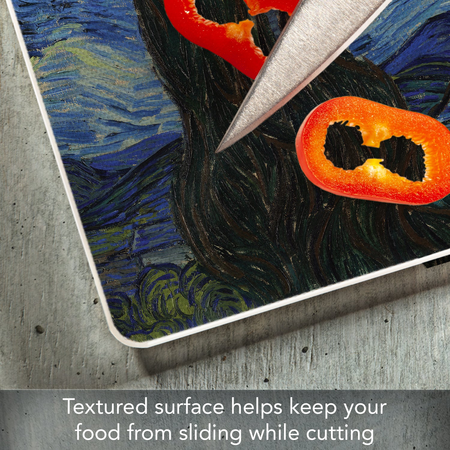 FEATURES-Surface of Cutting Board is slightly textured to help keep foods stable as they are being chopped and diced. Rubber Non-Skid feet on bottom of the board protects your surfaces from scratches and stains.