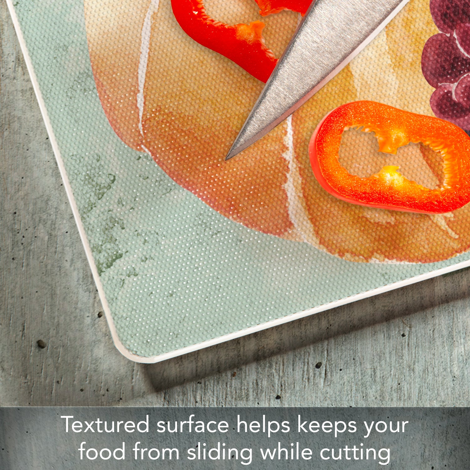 - FEATURES-Surface of Cutting Board is slightly textured to help keep foods stable as they are being chopped and diced. Rubber Non-Skid feet on bottom of the board protects your surfaces from scratches and stains.