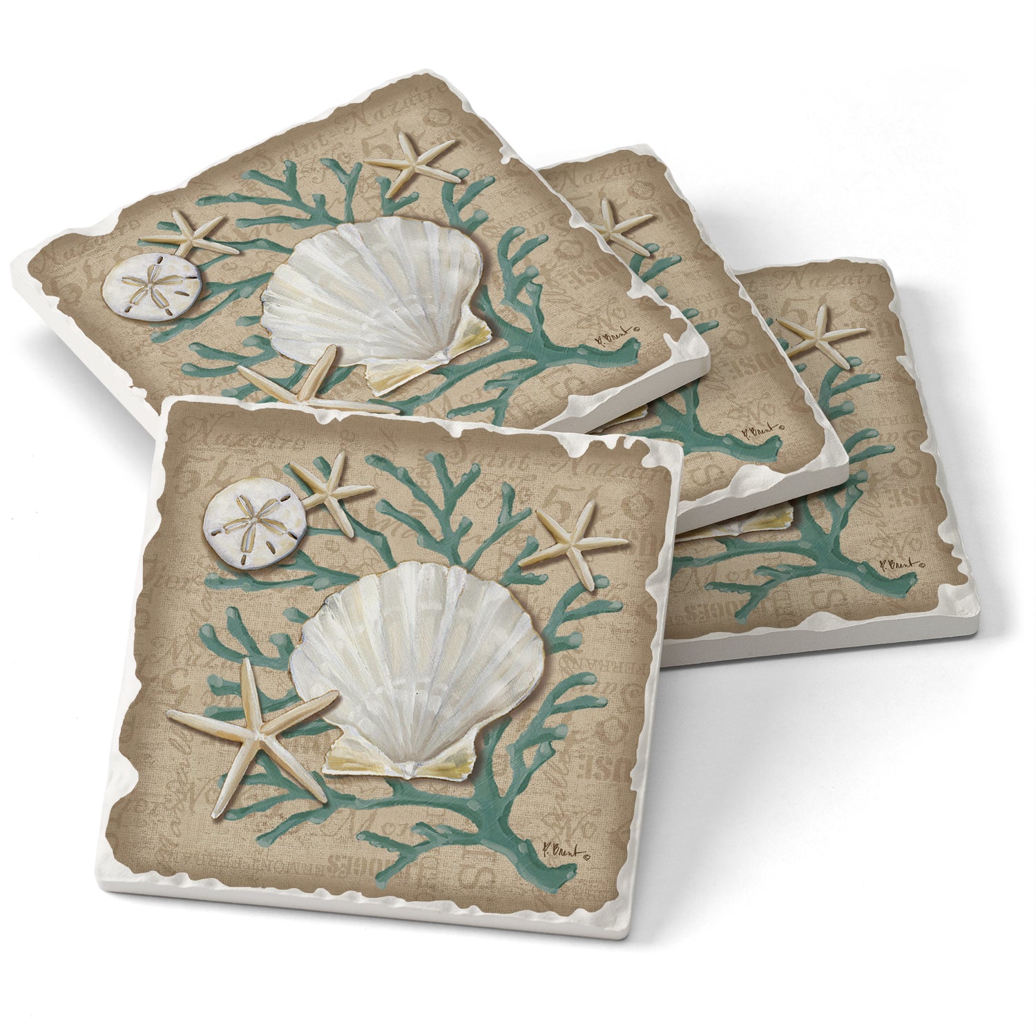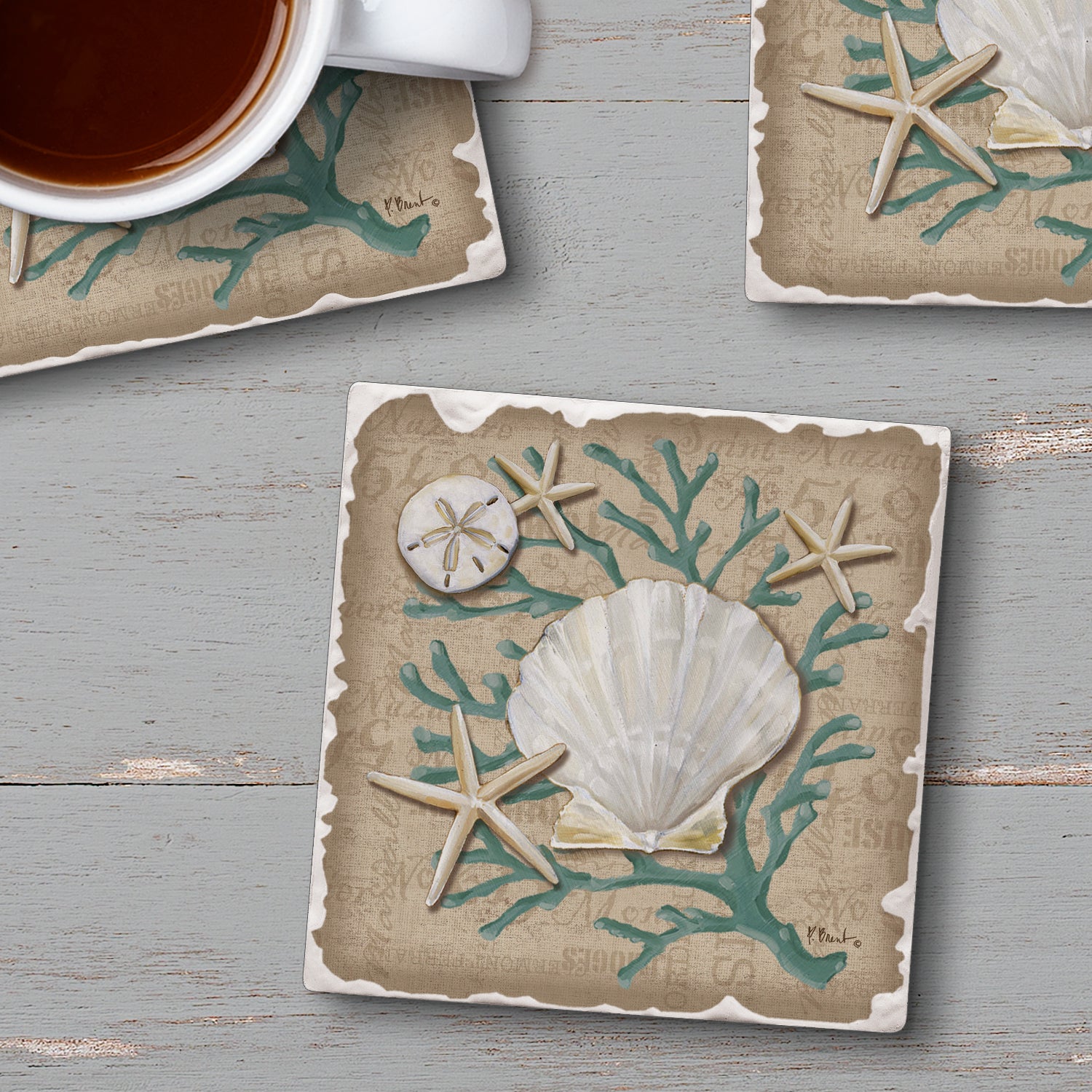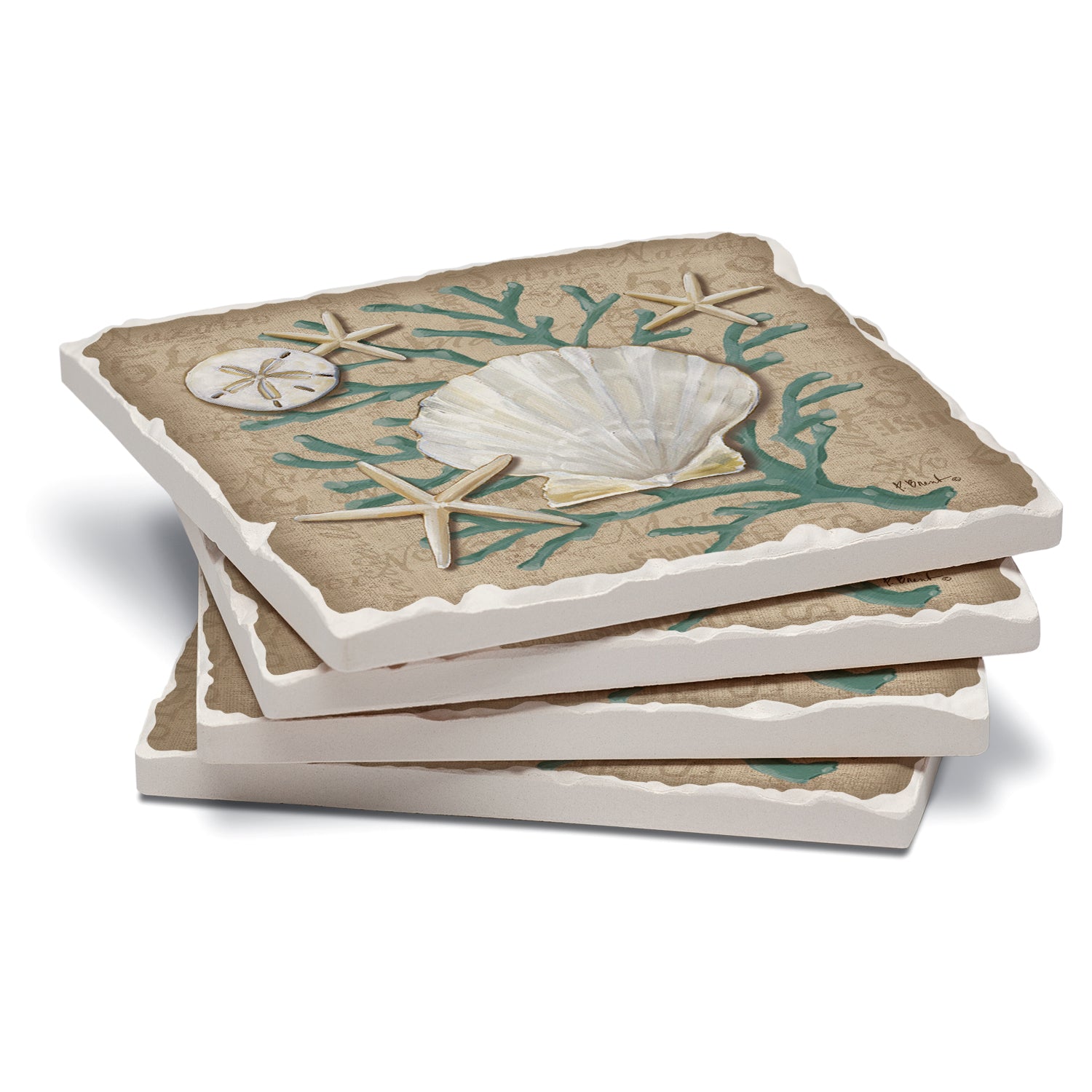 CounterArt Tumbled Tile Coasters, Linen Shells, Set of 4