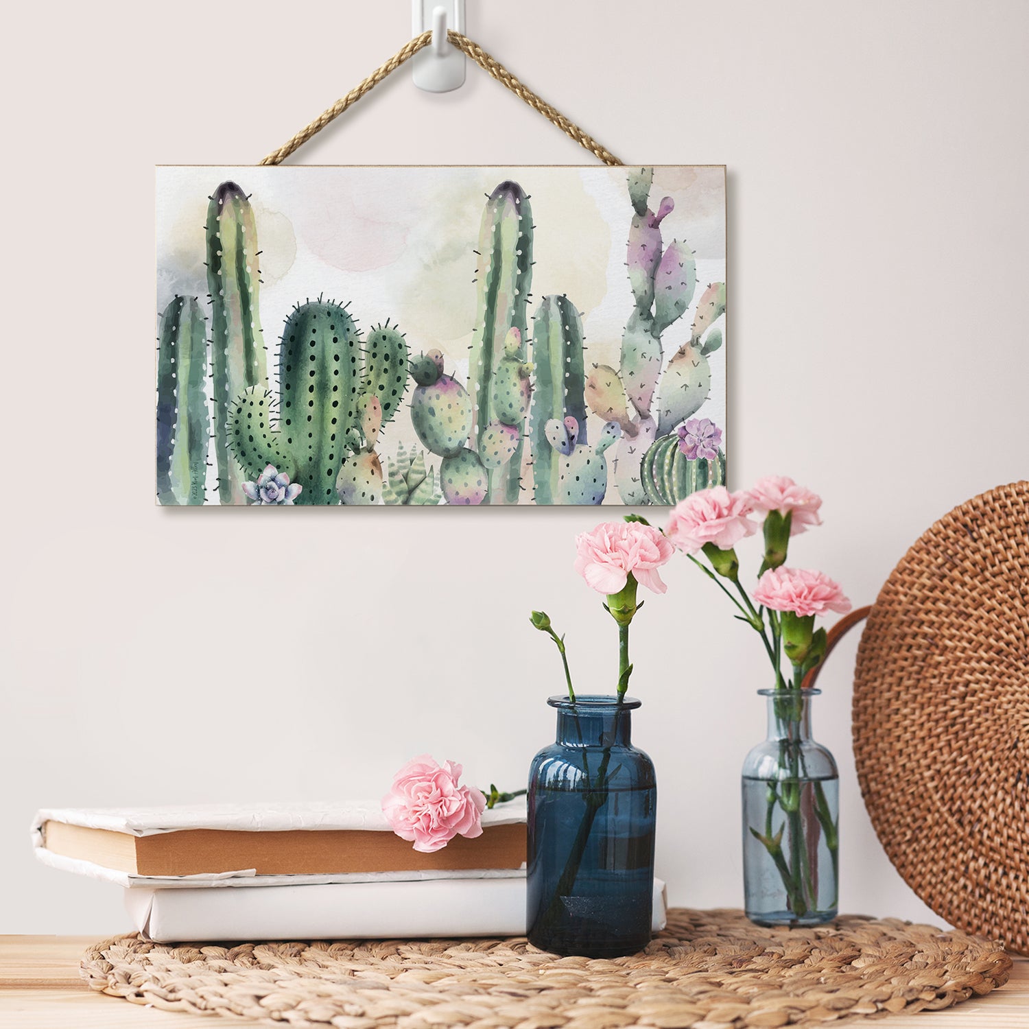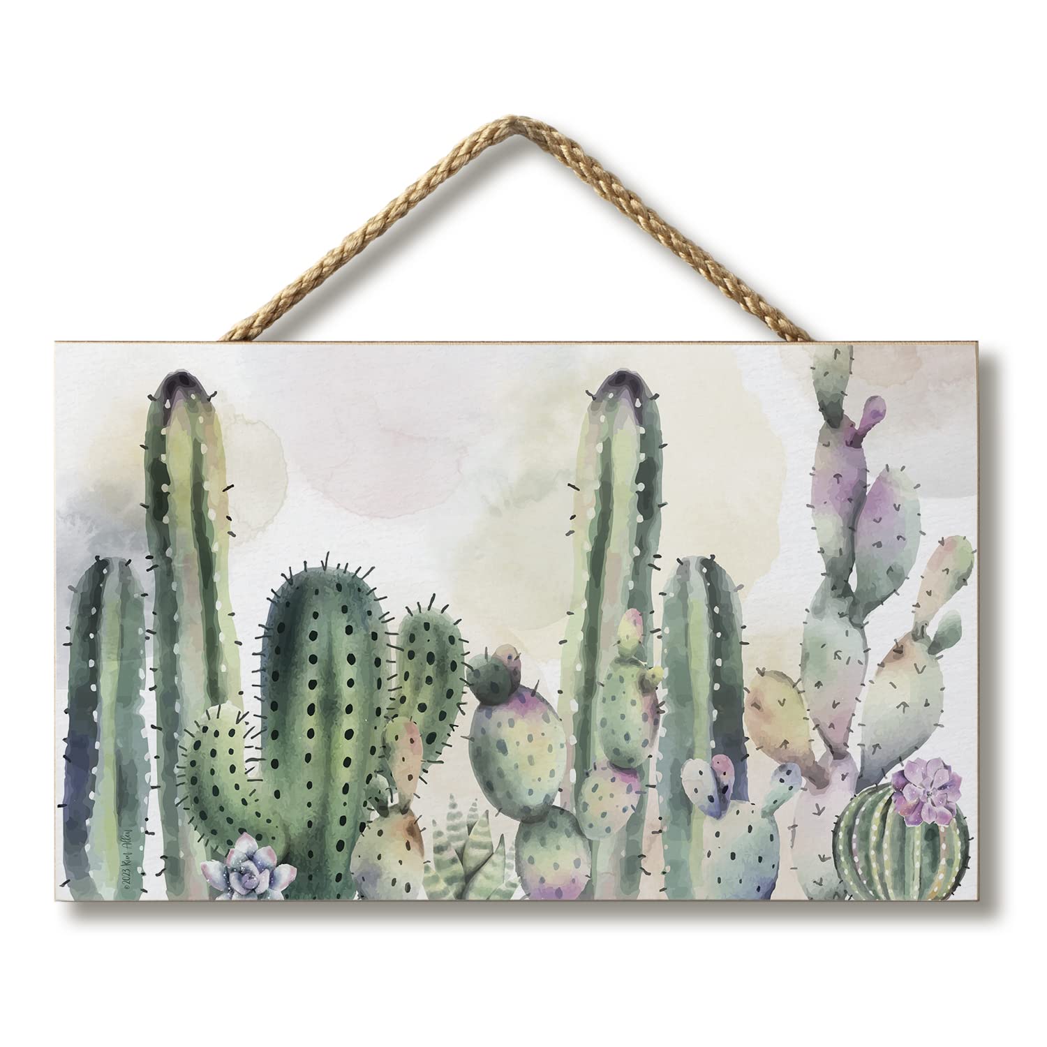 Watercolor Cactus Decorative Hanging Wood Wall Sign 9.5” by 5.75” Made in the USA