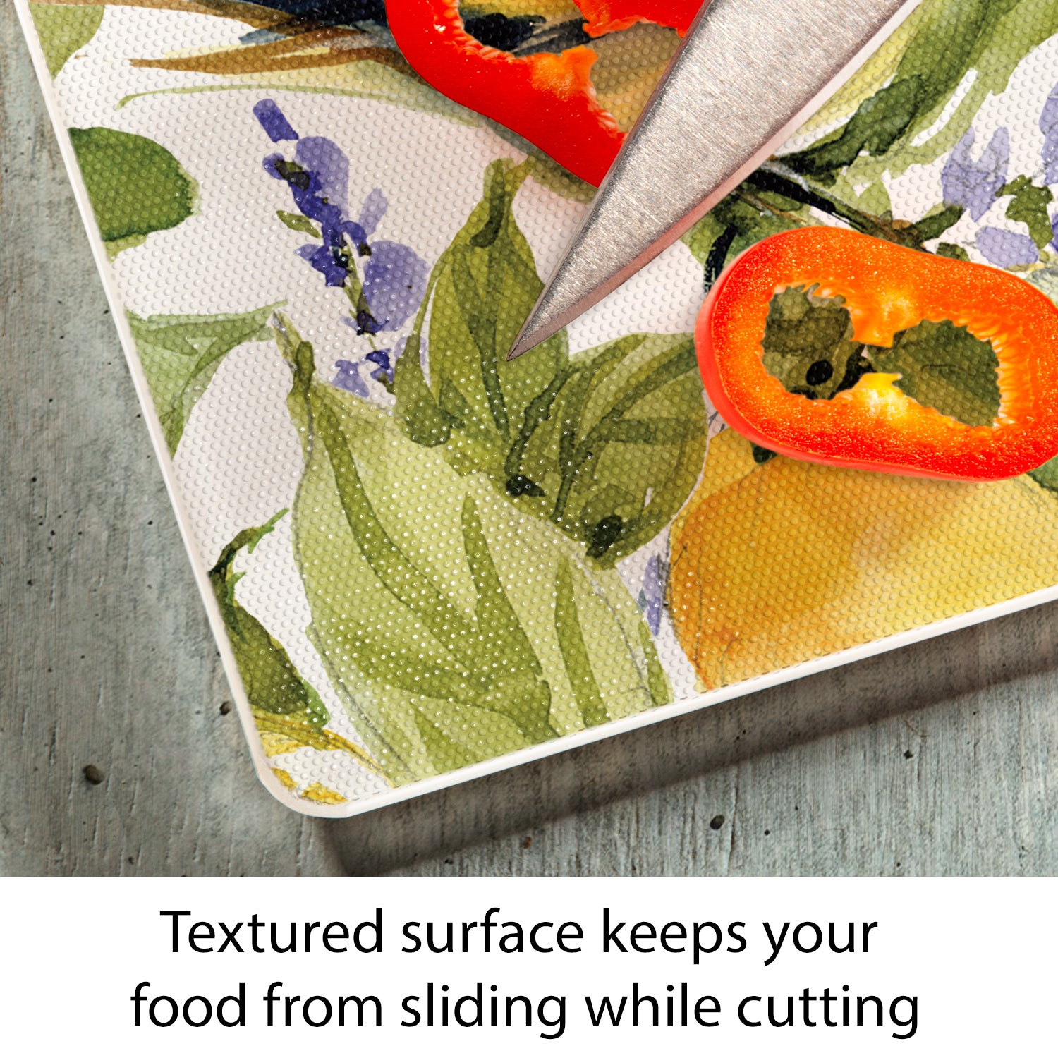 - FEATURES-Surface of Cutting Board is slightly textured to help keep foods stable as they are being chopped and diced. Rubber Non-Skid feet on bottom of the board protects your surfaces from scratches and stains.