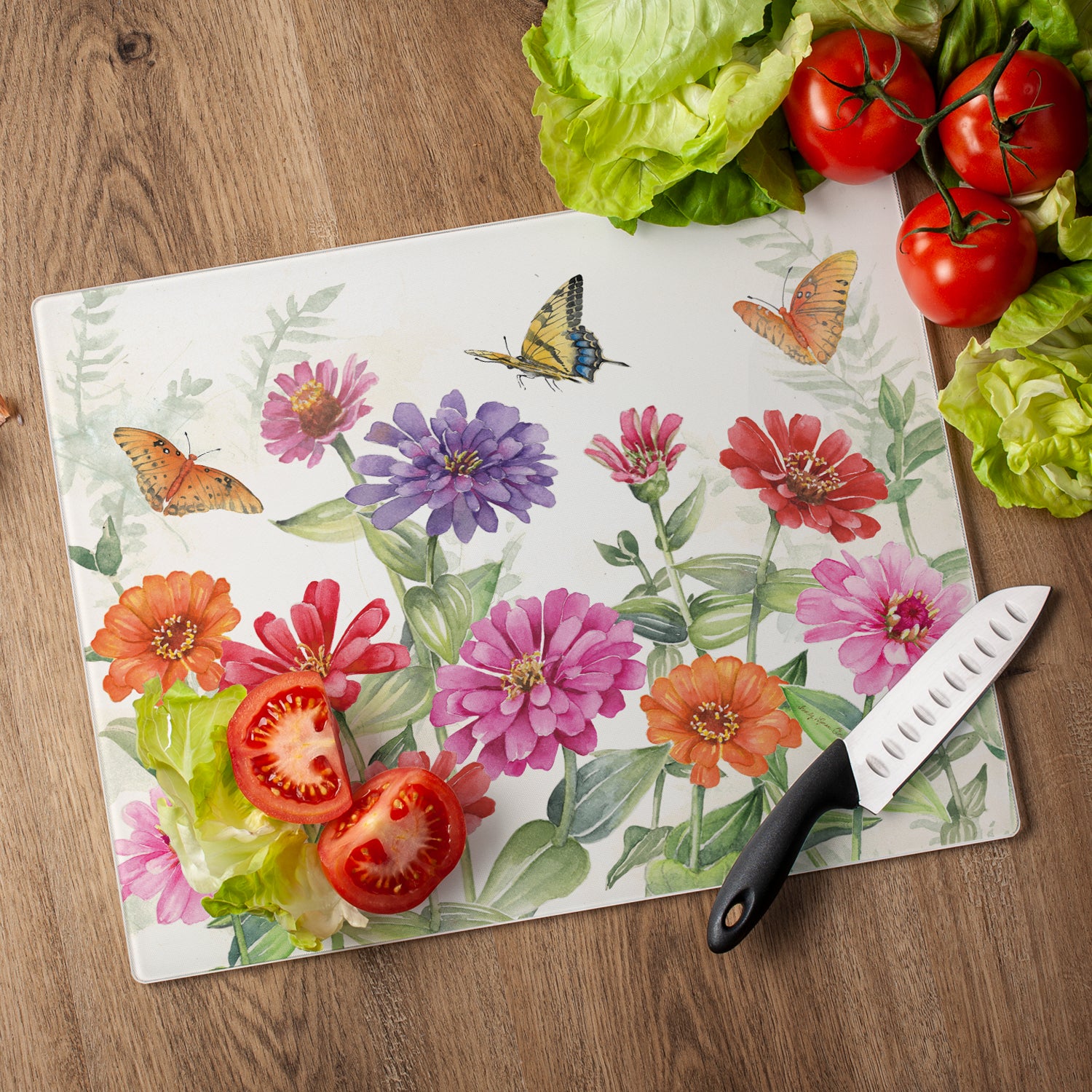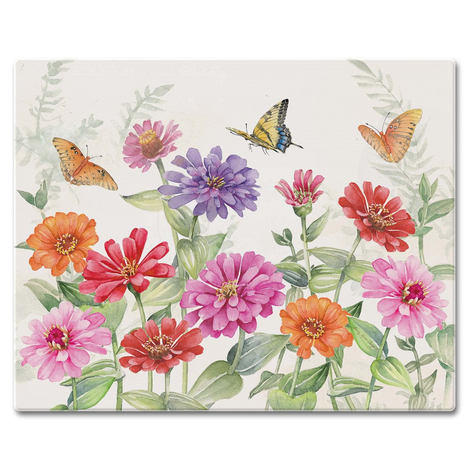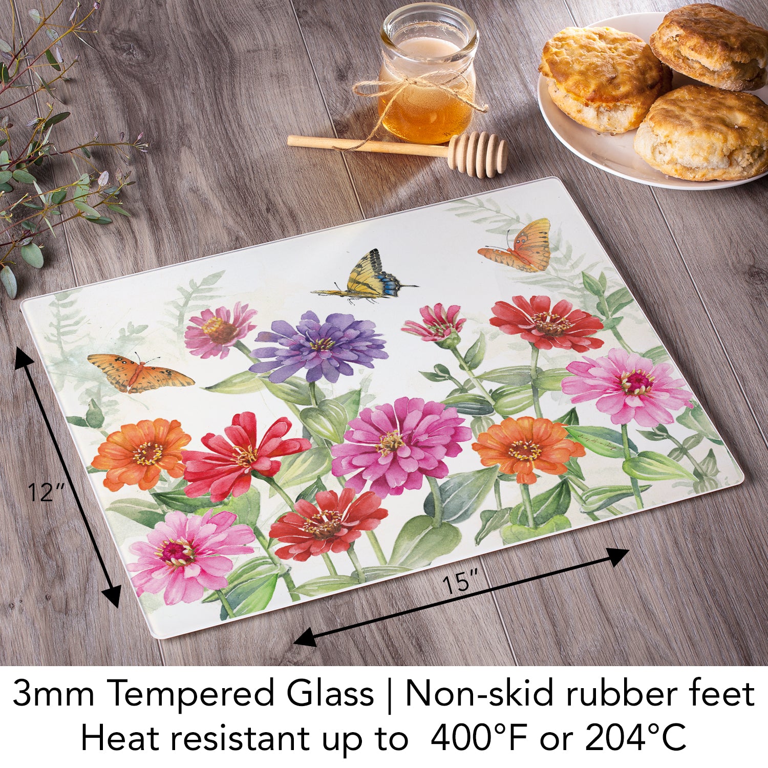 CounterArt Zinnias & Butterflies 3mm Tempered Glass Cutting Board 15" x 12" Manufactured in the USA