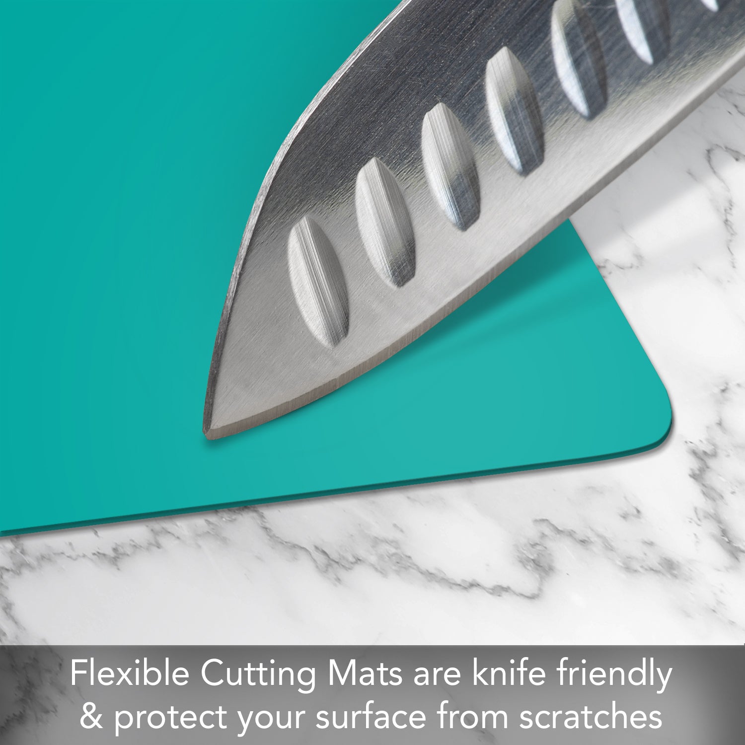 - BPA & PVC FREE- Thick Cutting Board Mats are made of premium food grade BPA & PVC Free plastic. Thick cutting board mats will not dull your favorite knives and will also provide a safe surface to chop, slice and cut foods. Great to use when cutting vegetables, fruits, or meats.