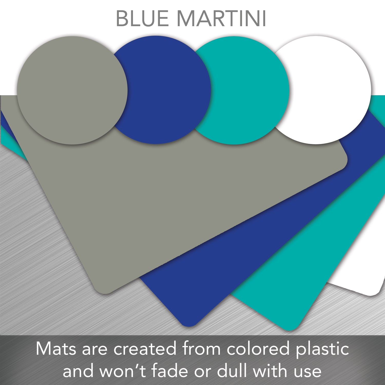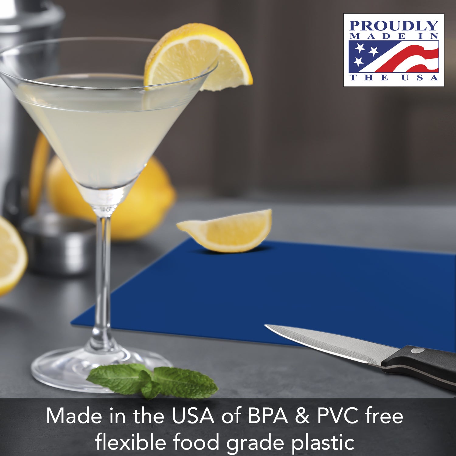 Cut N’ Funnel Blue Martini 4 Pack Thick Multicolor Plastic Cutting Board Mat Made in the USA BPA & PVC Free Plastic Mat Measures 8” x 6”.
