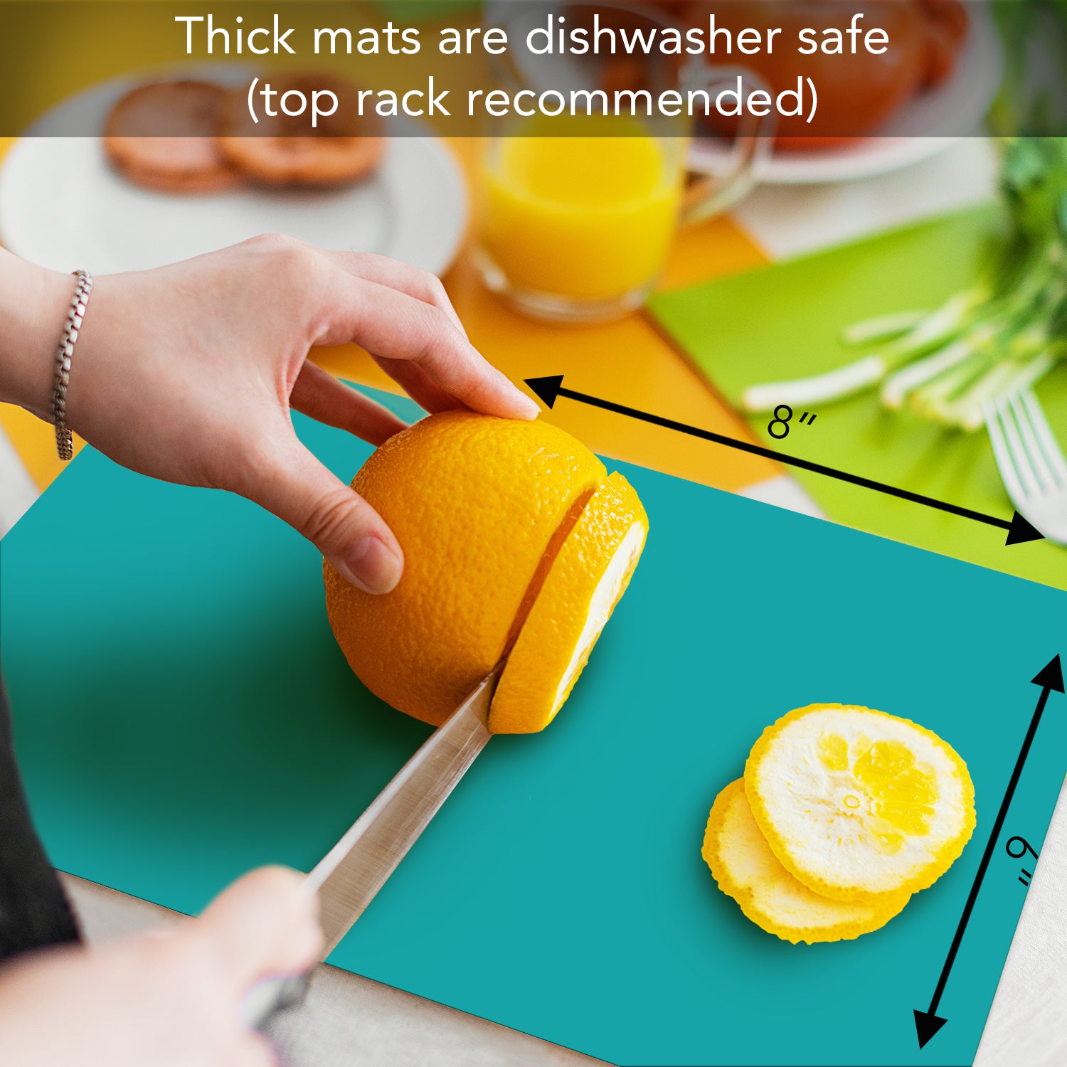 - MEASURES- Package contains 4-8†x 6†x 0.80" rectangular Cutting Board Mats. Mats come in 4 separate colors which allows for color coding when preparing foods. Example-Use Gray for meats, Blue for sea food, Teal for vegetables, and Opaque for breads and cheeses.