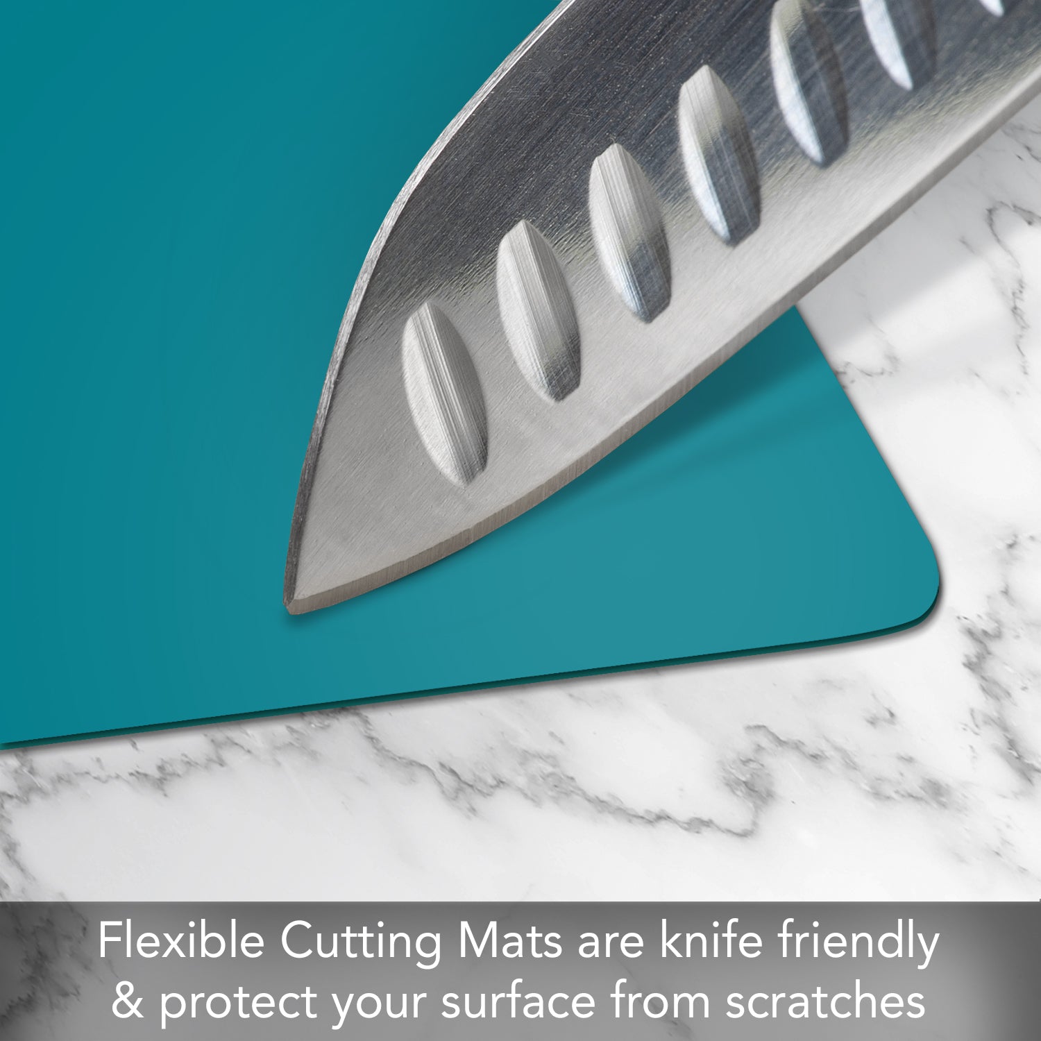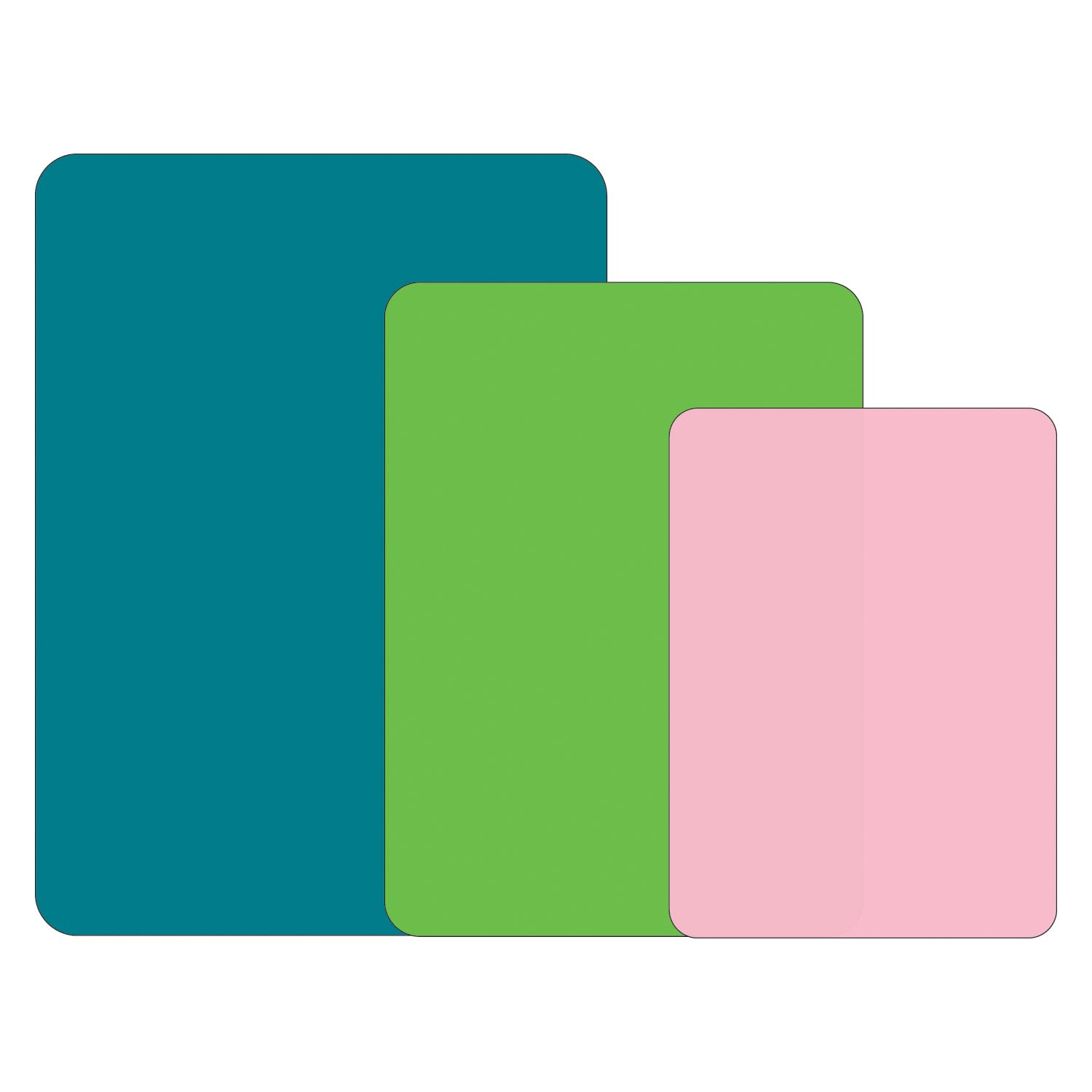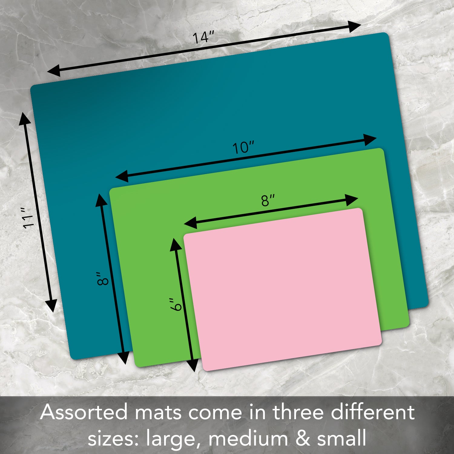 - MEASURES- Package contains 3 Cutting Board Mats. Includes 1-14†x 11, 1-10†x 8â€, 1-8†x 6. Mats come in 3 separate colors which allows for color coding when preparing foods. Example-Use teal for meats, green for vegetables, pink for breads and cheeses.
