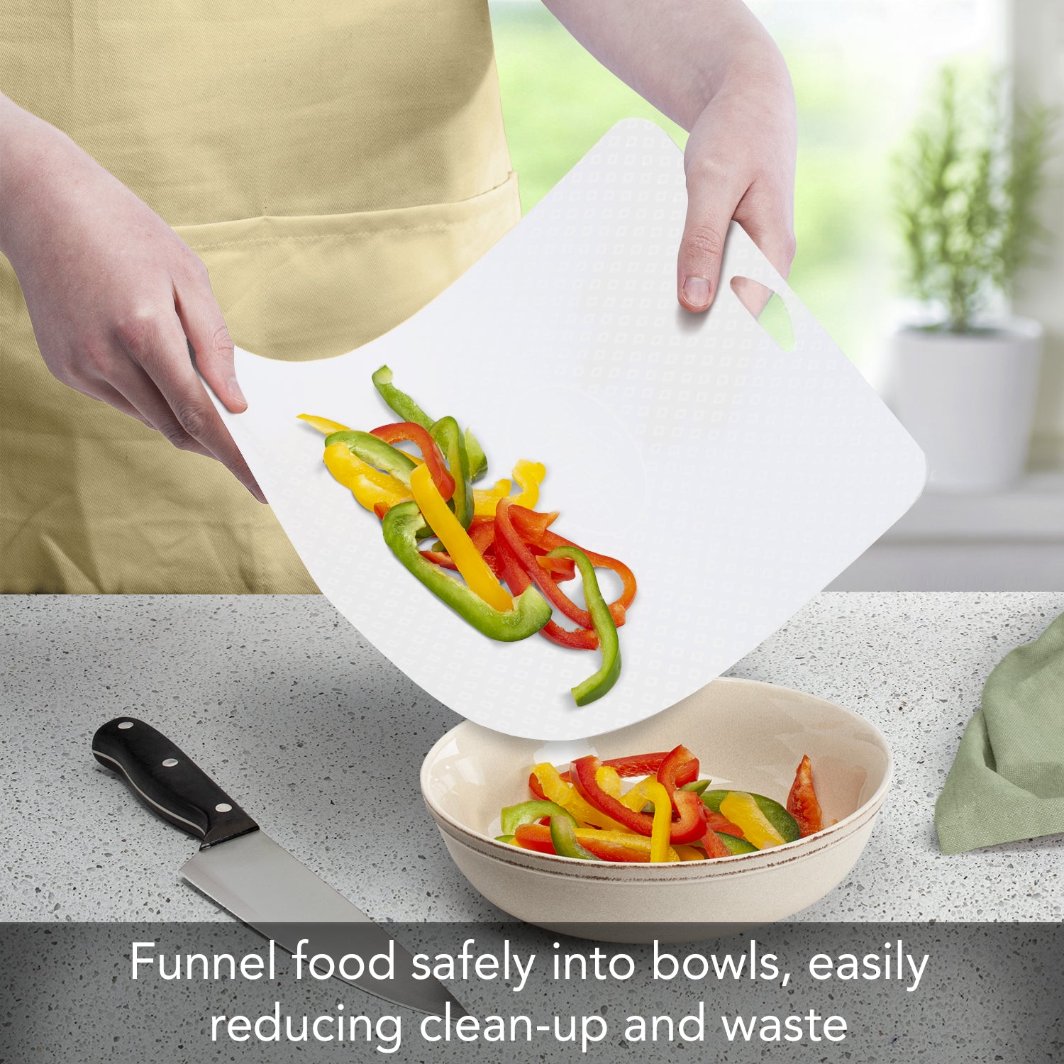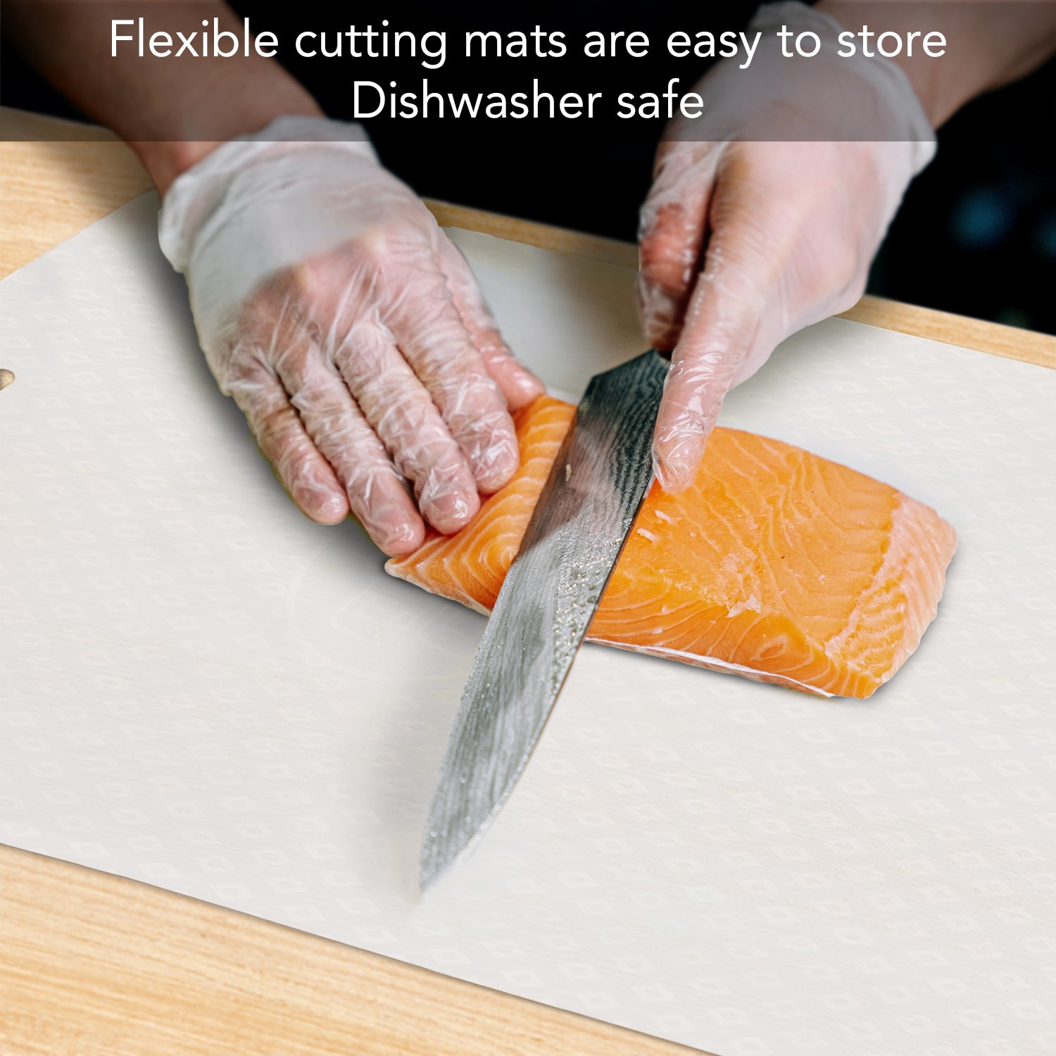 - FLEXIBLE PLASTIC- Cutting Board Mat is made of flexible plastic that bends to easily funnel chopped, sliced, or shredded food directly into a bowl, pan, or food processor. Clean up is easy with these flexible Cutting Mats. Transfer scraps, seeds, or fats directly from the Mat to the trash receptacle.