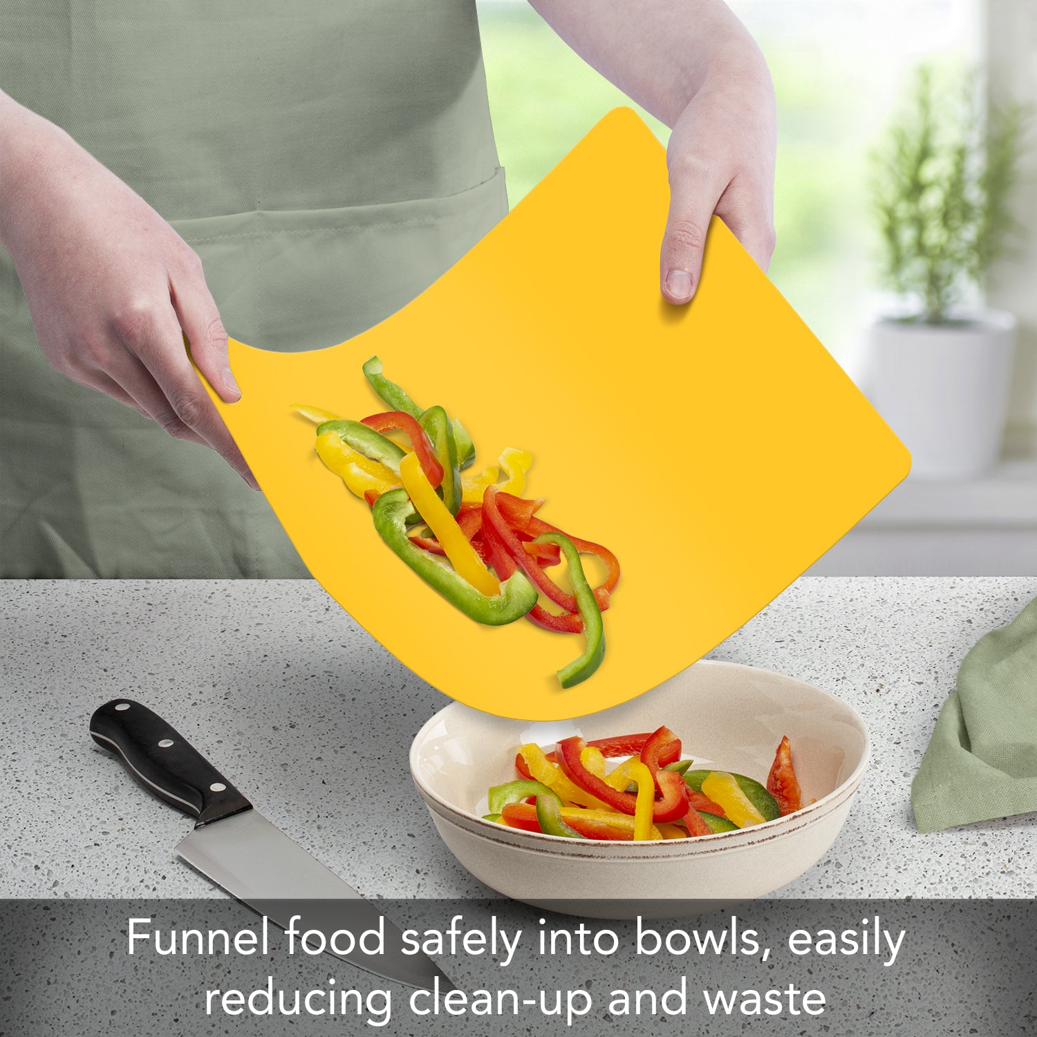 - FLEXIBLE PLASTIC- Cutting Board Mat is made of flexible plastic that bends to easily funnel chopped, sliced, or shredded food directly into a bowl, pan, or food processor. Great for chopping garnish fruit for cocktails. Clean up after use is easy with these flexible Cutting Mats. Transfer scraps, seeds, or fats directly from the Mat to the trash receptacle.