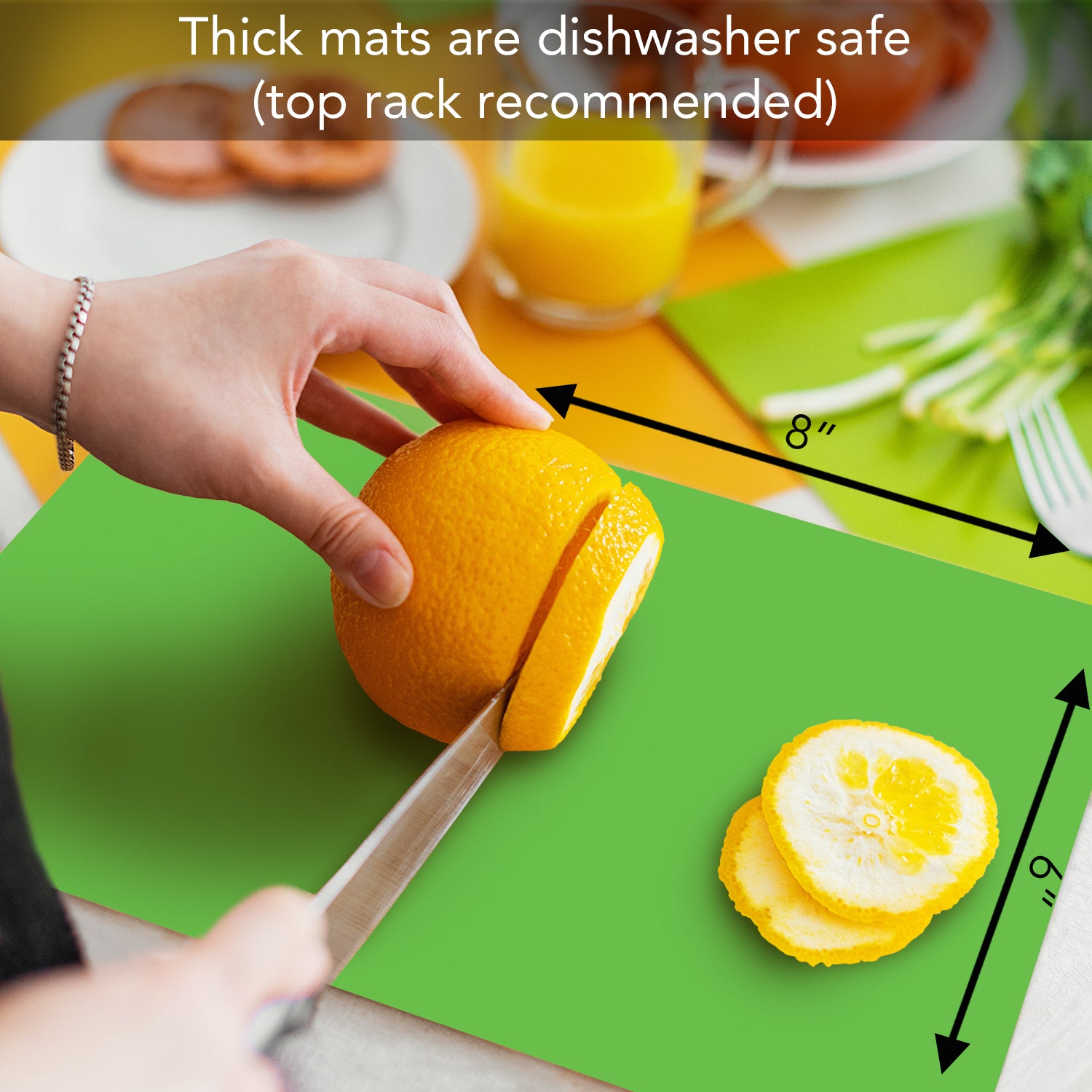 - MEASURES- Package contains 4-8†x 6†x 0.80†rectangular Cutting Board Mats. Mats come in 4 separate colors which allows for color coding when preparing foods. Example-Use Teal for meats, Pink for sea food, Green for vegetables, and Opaque for breads and cheeses.