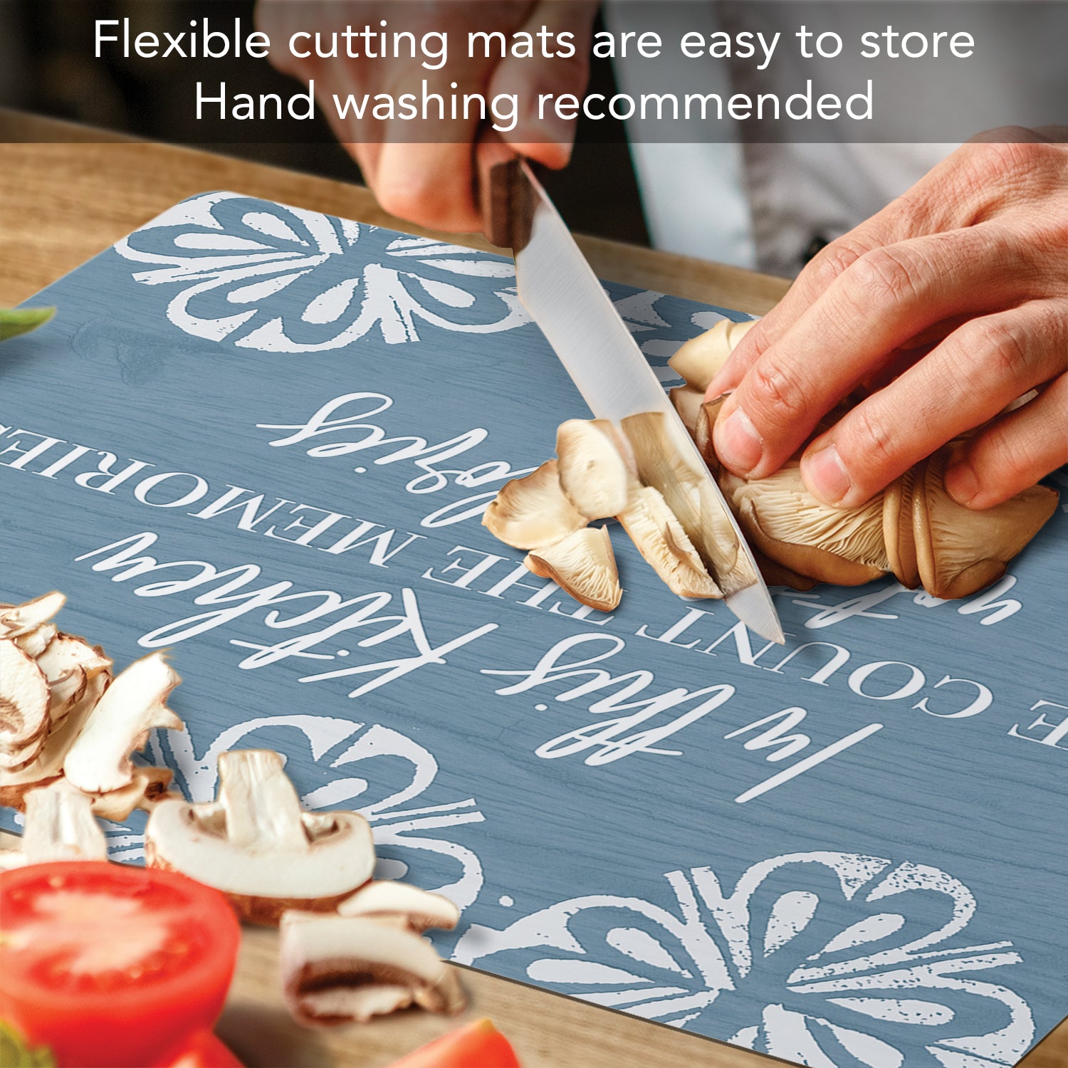 MEASUREMENTS-Each Mat measures 15” x 11.5” x .04”. Cutting Board Mats can be hand washed with soap and water. Flexible cutting board mat will not dull your favorite knives and provides a safe surface to chop, slice and cut foods.