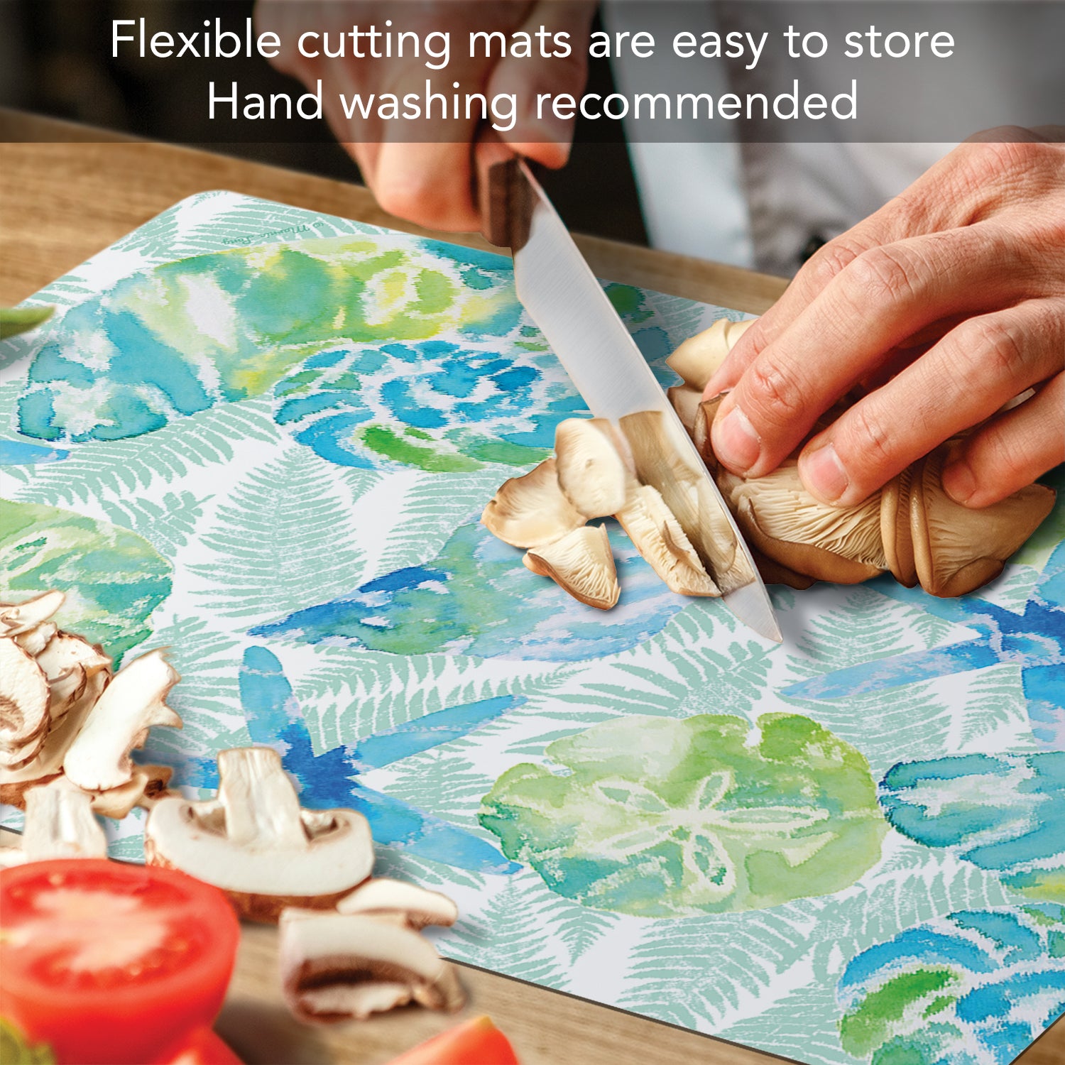 - KNIFE FRIENDLY-Flexible cutting board mat will not dull your favorite knives and provides a safe surface to chop, slice and cut foods. Great to use when cutting vegetables, fruits, or meats.