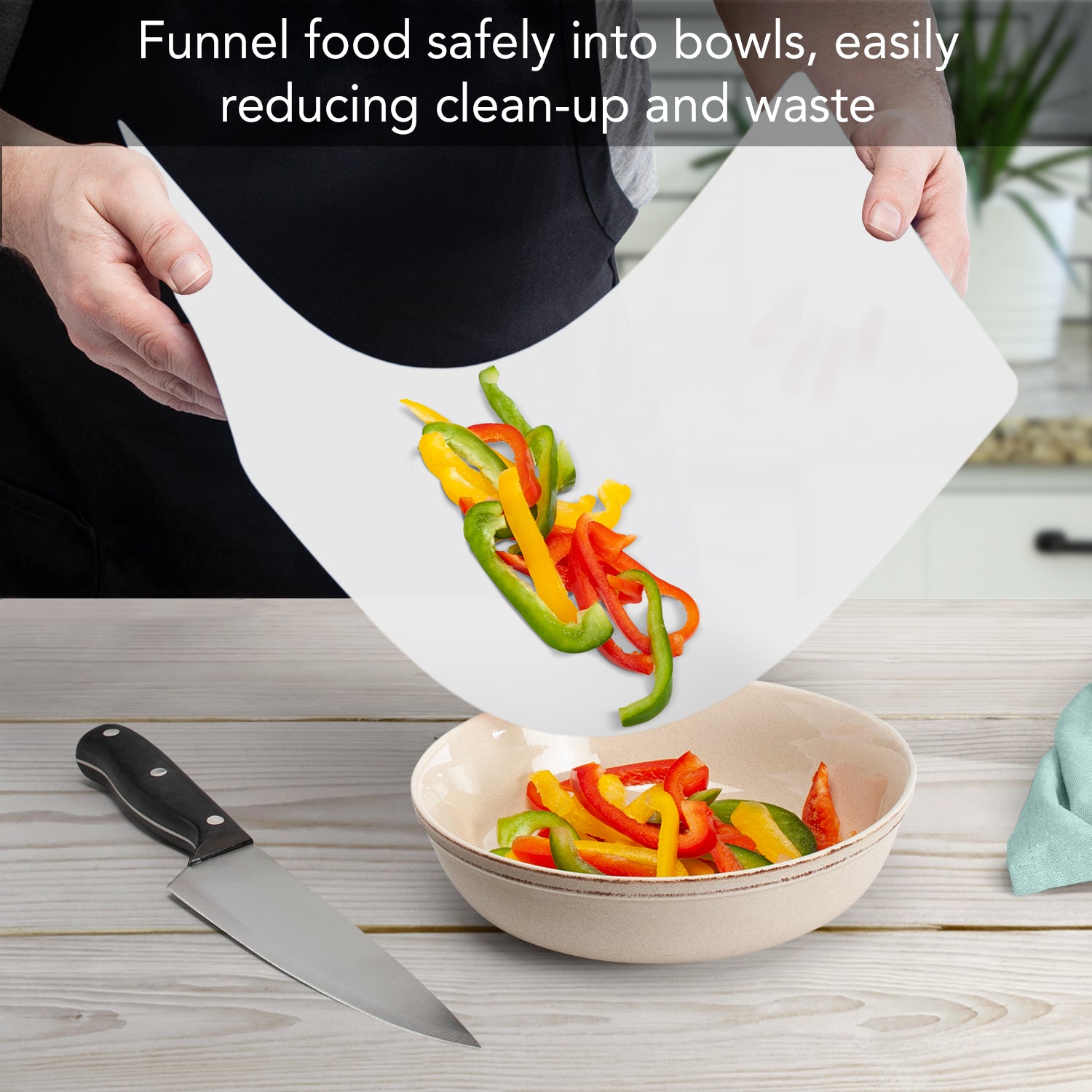 - FLEXIBLE PLASTIC- Cutting Board Mat is made of flexible plastic that bends to easily funnel chopped, sliced, or shredded food directly into a bowl, pan, or food processor. Clean up is easy with these flexible Cutting Mats. Transfer scraps, seeds, or fats directly from the Mat to the trash receptacle.