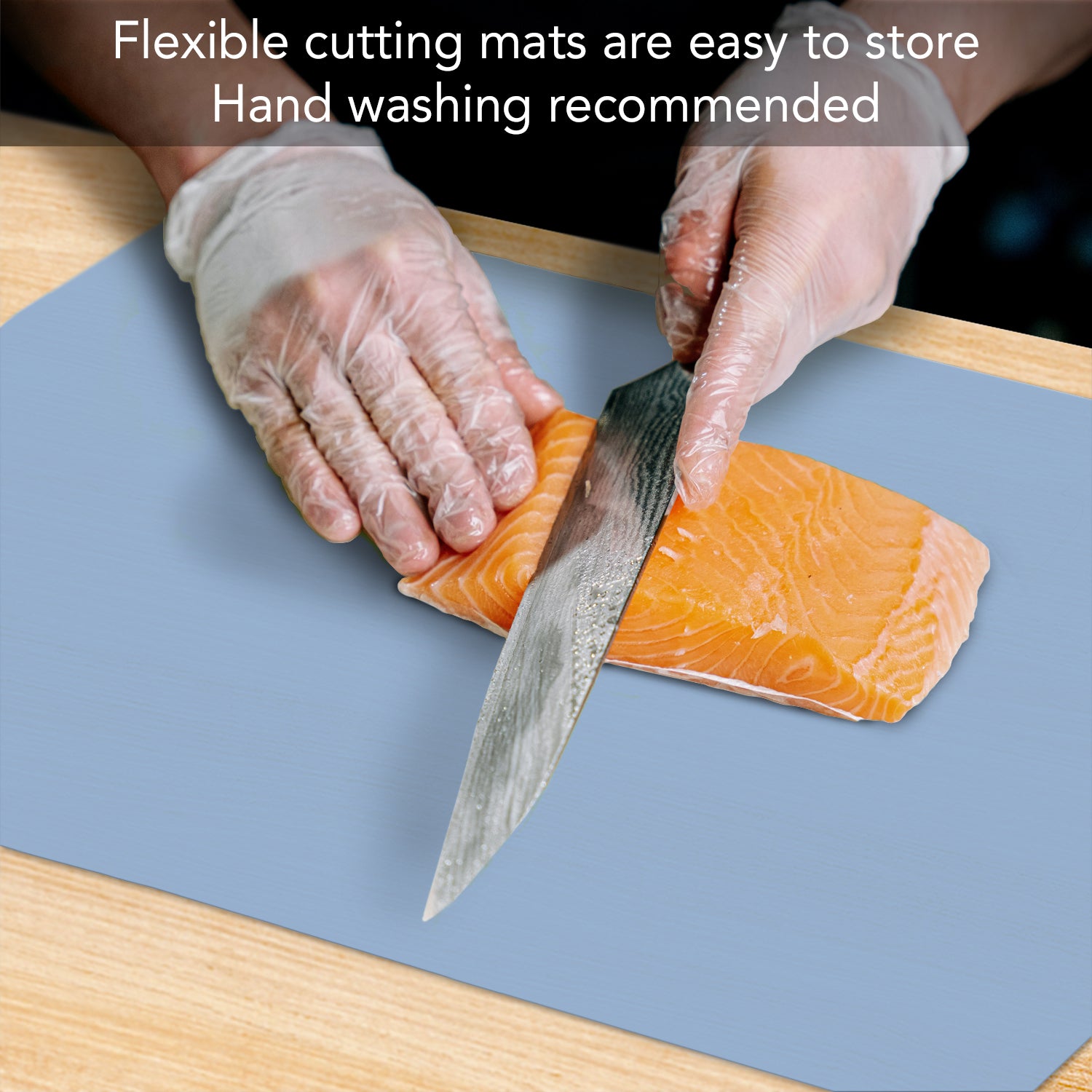 - FLEXIBLE PLASTIC- Cutting Board Mat is made of flexible plastic that bends to easily funnel chopped, sliced, or shredded food directly into a bowl, pan, or food processor. Great for chopping garnish fruit for cocktails. Clean up after use is easy with these flexible Cutting Mats. Transfer scraps, seeds, or fats directly from the Mat to the trash receptacle.