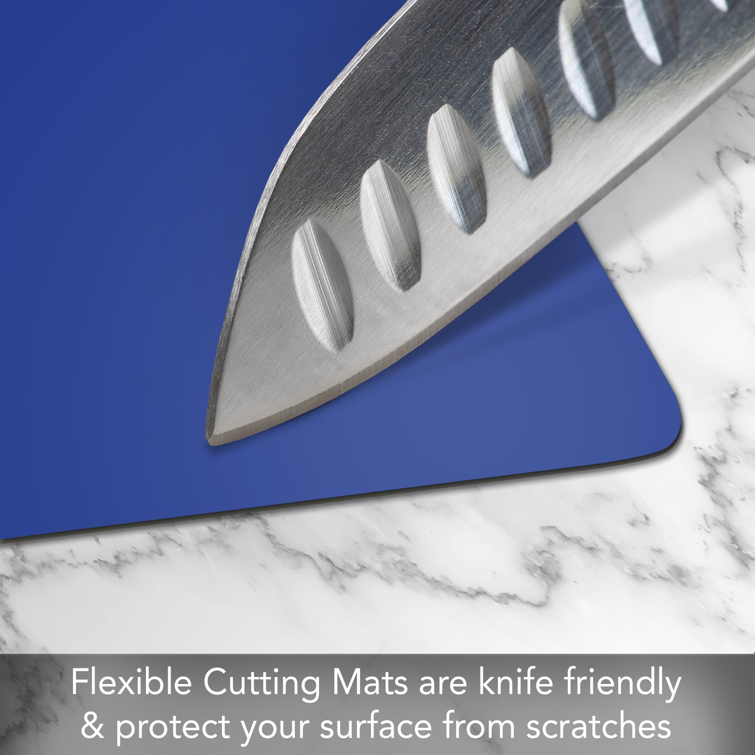 - BPA & PVC FREE- Thick Cutting Board Mats are made of premium food grade BPA & PVC Free plastic. Thick cutting board mats will not dull your favorite knives and will also provide a safe surface to chop, slice and cut foods. Great to use when cutting vegetables, fruits, or meats.