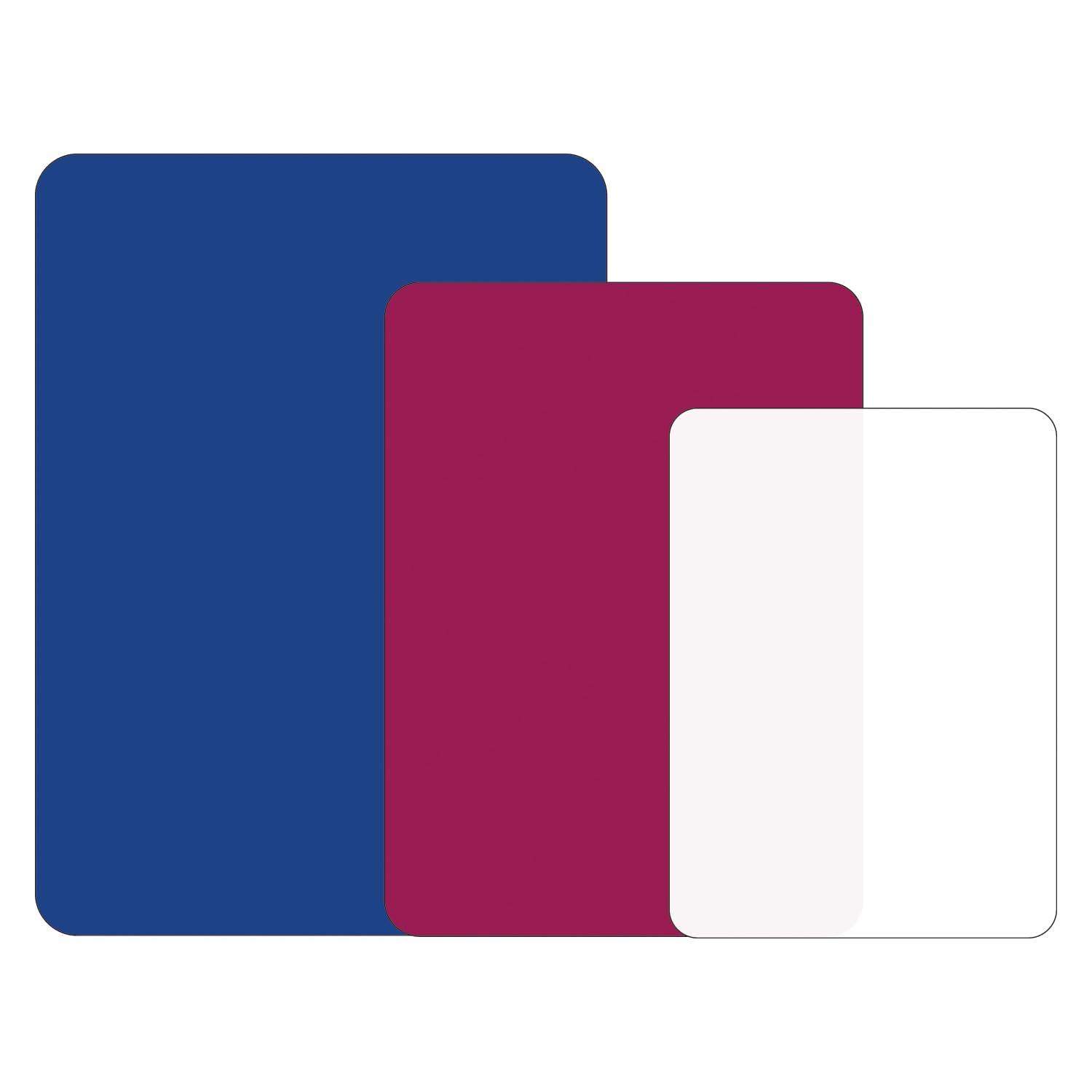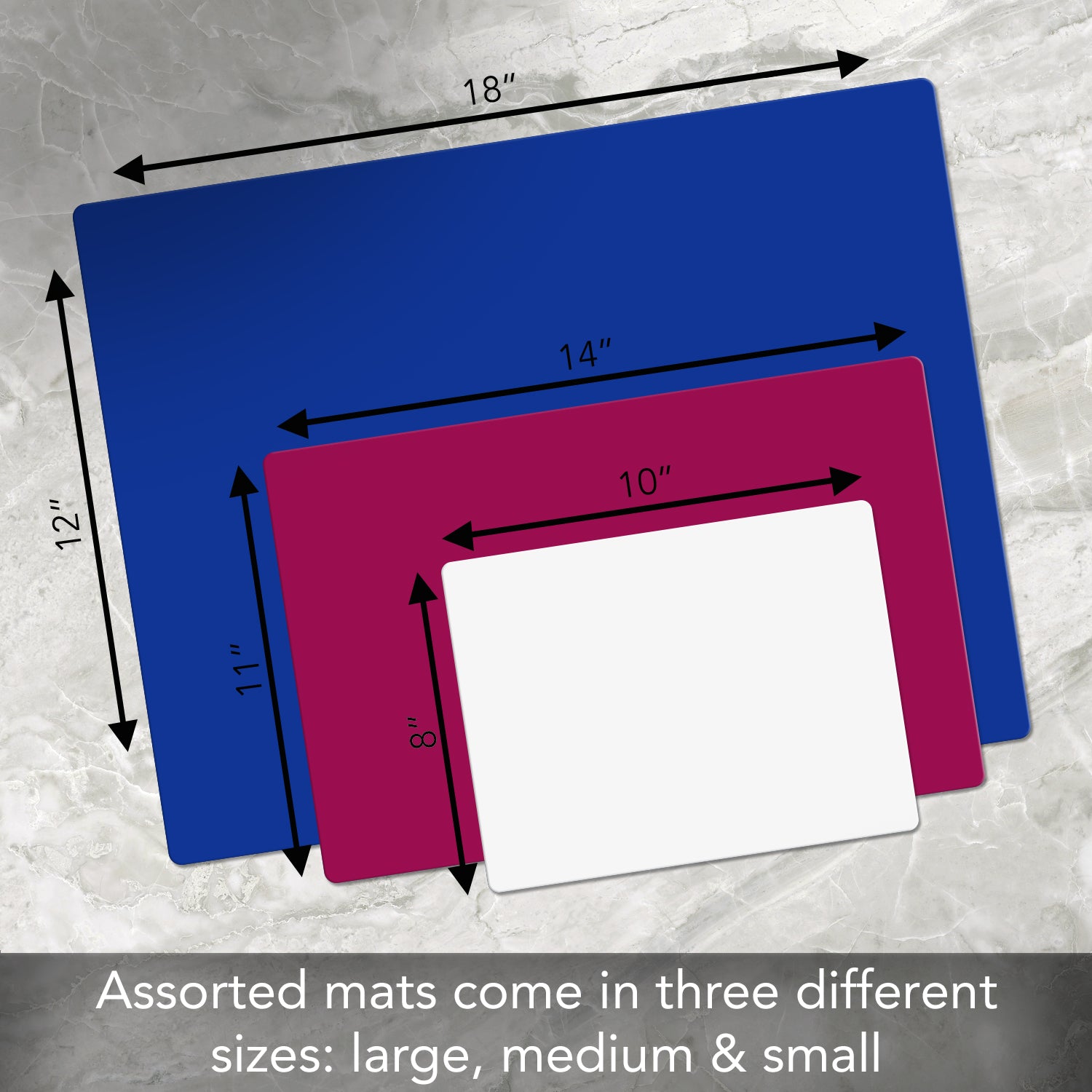 - MEASURES- Package contains 3 separate mats. Package includes 1-18†x 12â€, 1-14†x 11â€, and 1-10†x 8†rectangular Cutting Board Mat. Mats come in 3 separate colors which allows for color coding when preparing foods. Example-Use Dark Red for meats, Blue for vegetables, and Opaque for breads and cheeses.