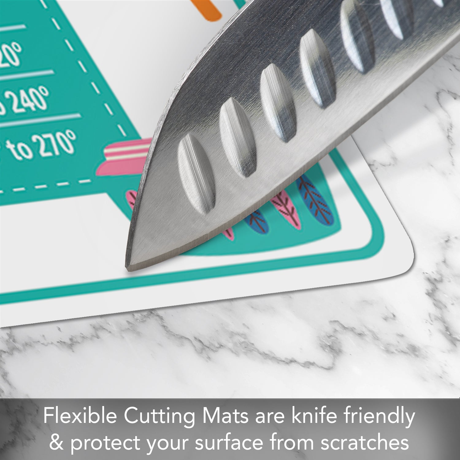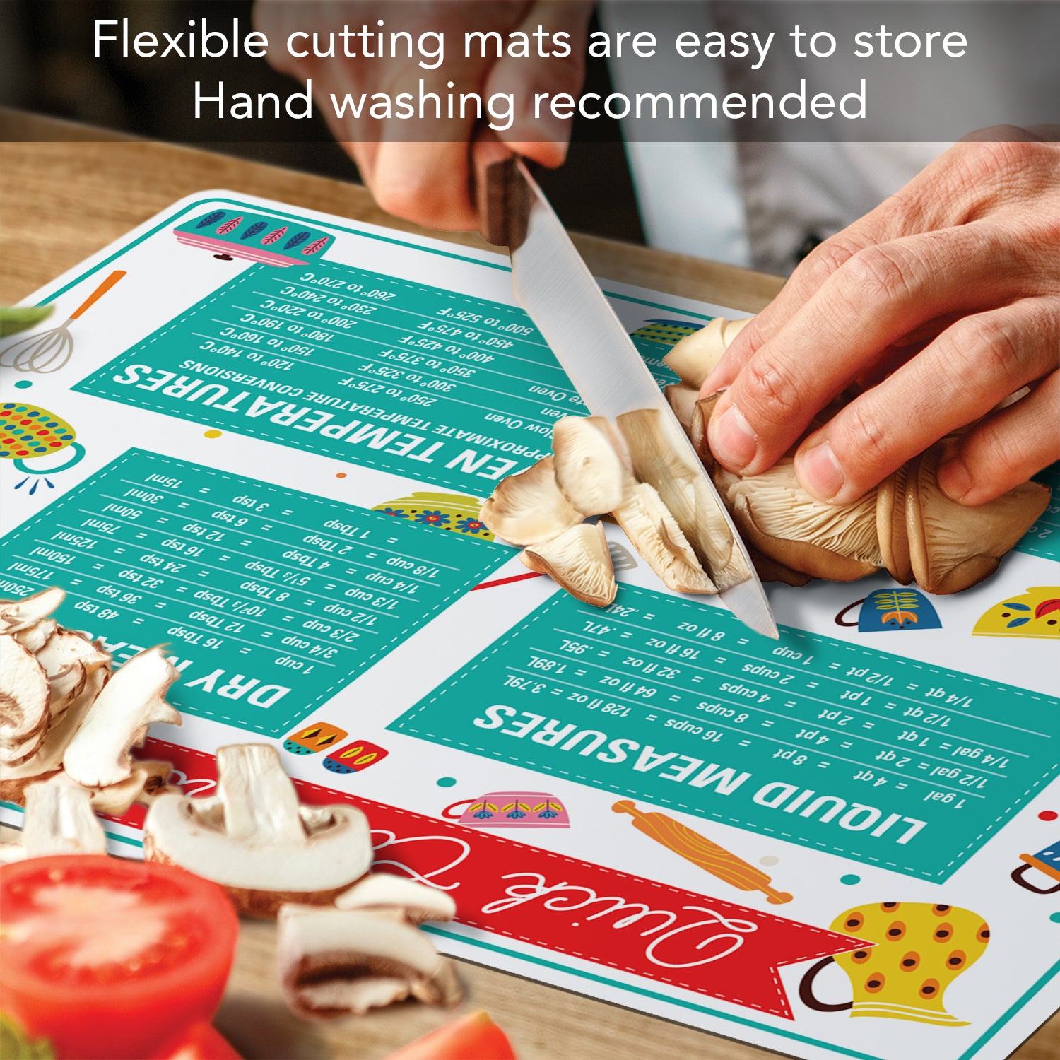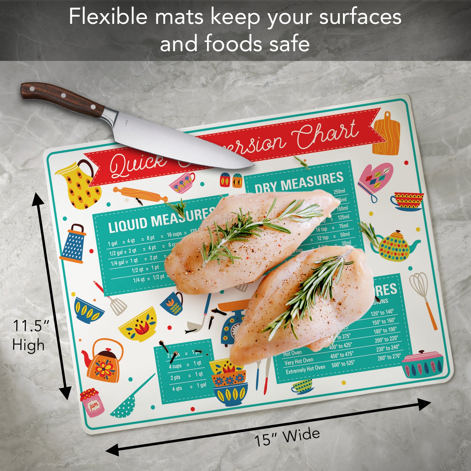 MEASUREMENTS-Each Mat measures 15” x 11.5” x .04”. Cutting Board Mats can be hand washed with soap and water. Flexible cutting board mat will not dull your favorite knives and provides a safe surface to chop, slice and cut foods.
