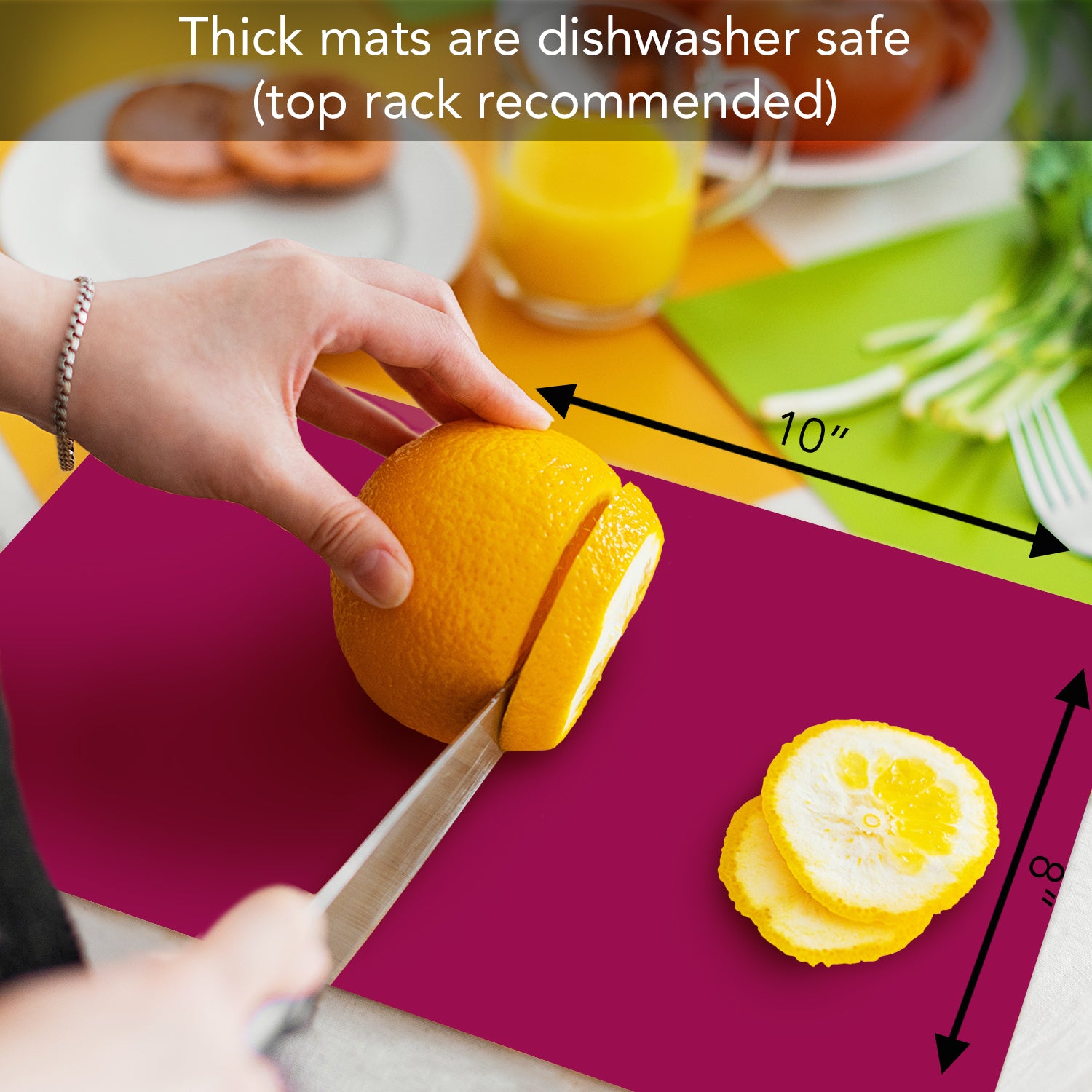 - MEASURES- Package contains 4-10†x 8†x 0.80†rectangular Cutting Board Mats. Mats come in 4 separate colors which allows for color coding when preparing foods. Example-Use Dark Red for meats, Pink for sea food, Gray for vegetables, and Opaque for breads and cheeses.