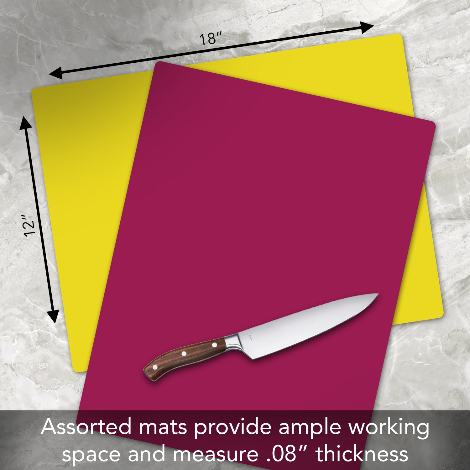 - MEASURES- Package contains 2 Cutting Board Mats. Each Mat measures 18†x 12†x 0.80†and is rectangular in shape. Mats come in 2 separate colors which allows for color coding when preparing foods. Example-Use red for meats and yellow for vegetables.