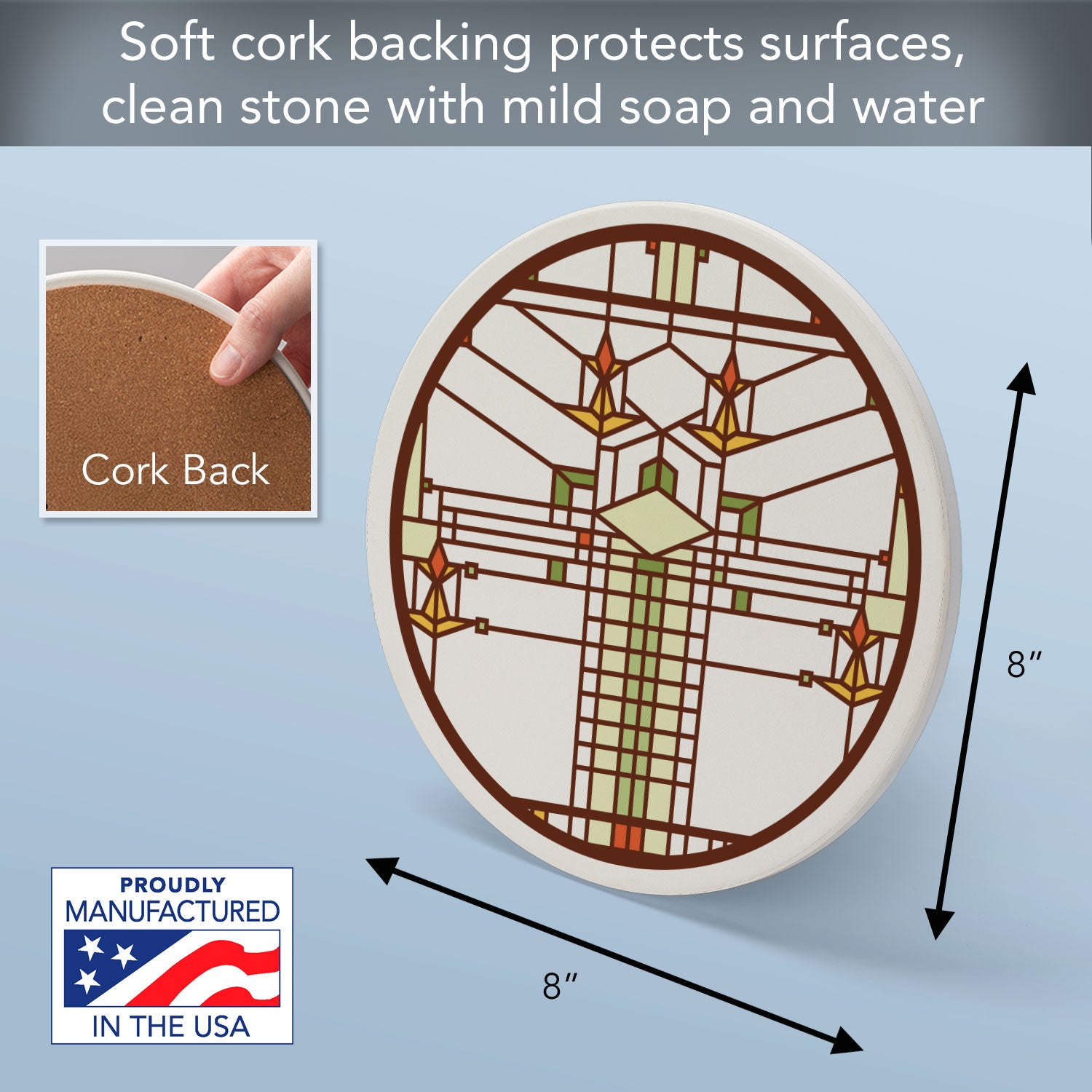 CORK BACKING-Each Trivet has an attached Non-Skid Cork Backing. Cork backing assists in keeping the Trivet stabilized when in use. Cork backing also protects your surfaces from scratches and stains.