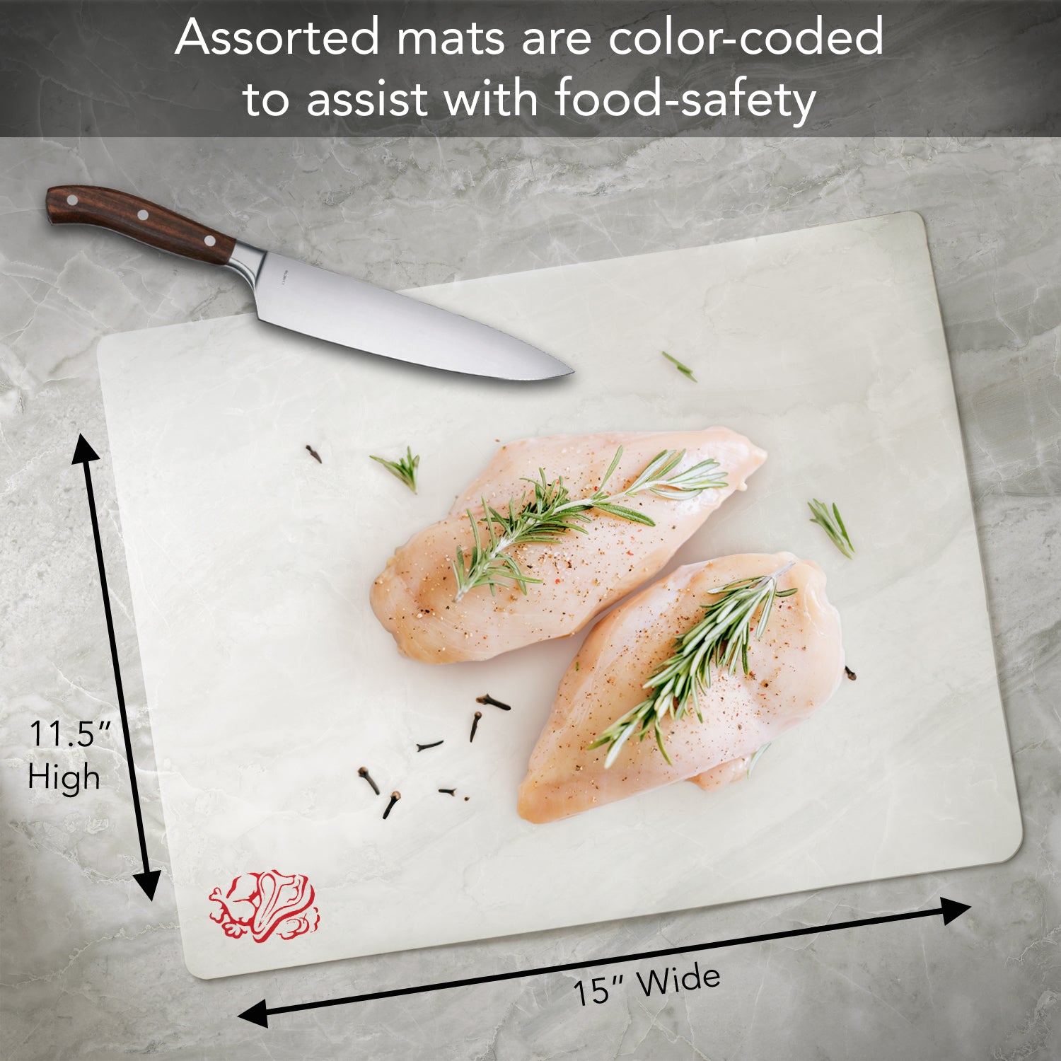 - COLOR CODED FOOD ICONS TO INDICATE FOOD TYPE USE. Each flexible cutting board mat has a vegetable, meat or fish icon to designate use by food type.