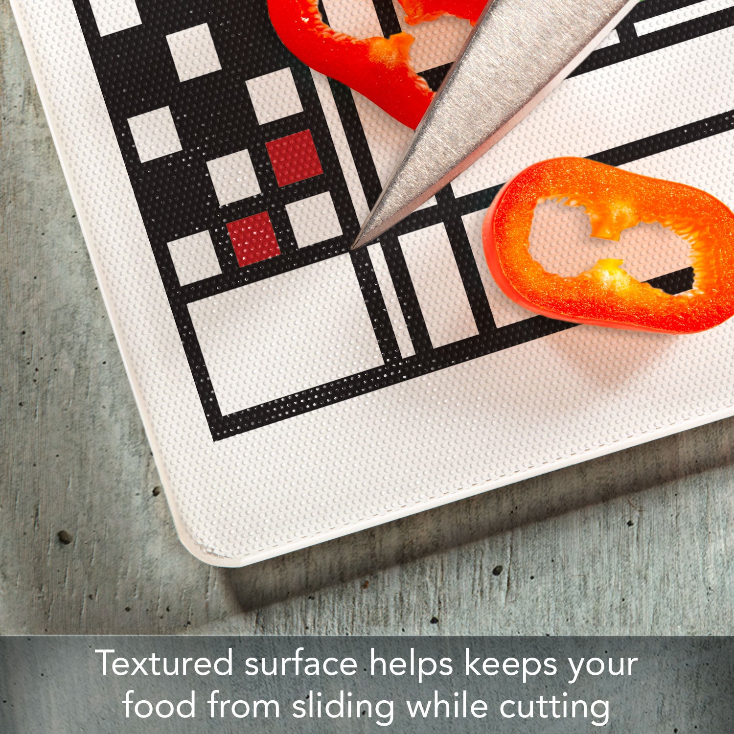 - FEATURES- Surface of Cutting Board is slightly textured to help keep foods stable as they are being chopped and diced. Rubber Non-Skid feet on bottom of the board protects your surfaces from scratches and stains.