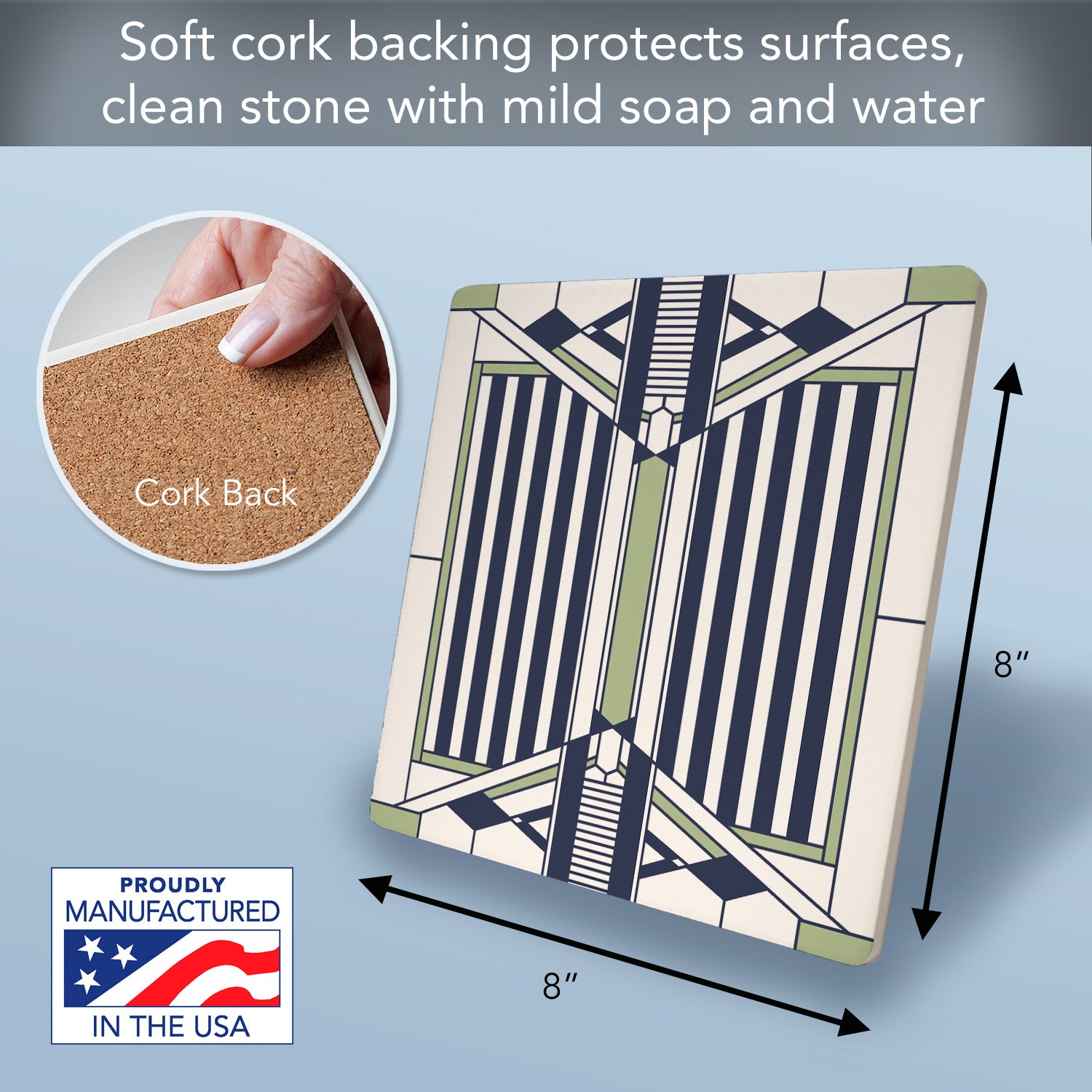 CORK BACKING-Each Trivet has an attached Non-Skid Cork Backing. Cork backing assists in keeping the Trivet stabilized when in use. Cork backing also protects your surfaces from scratches and stains.